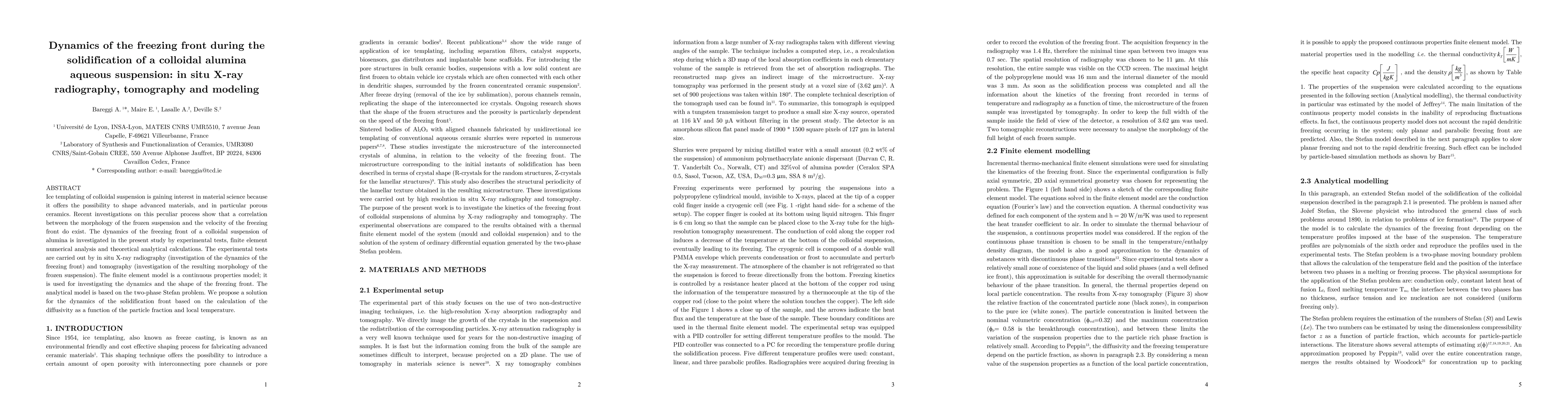 This paper investigates the dynamics of the freezing front during the solidification of a colloidal alumina aqueous suspension using in situ X-ray radiography, tomography, and modeling. The study combines experimental tests, finite element analysis, and theoretical calculations to understand the correlation between freezing front velocity and the resulting porous ceramic morphology.