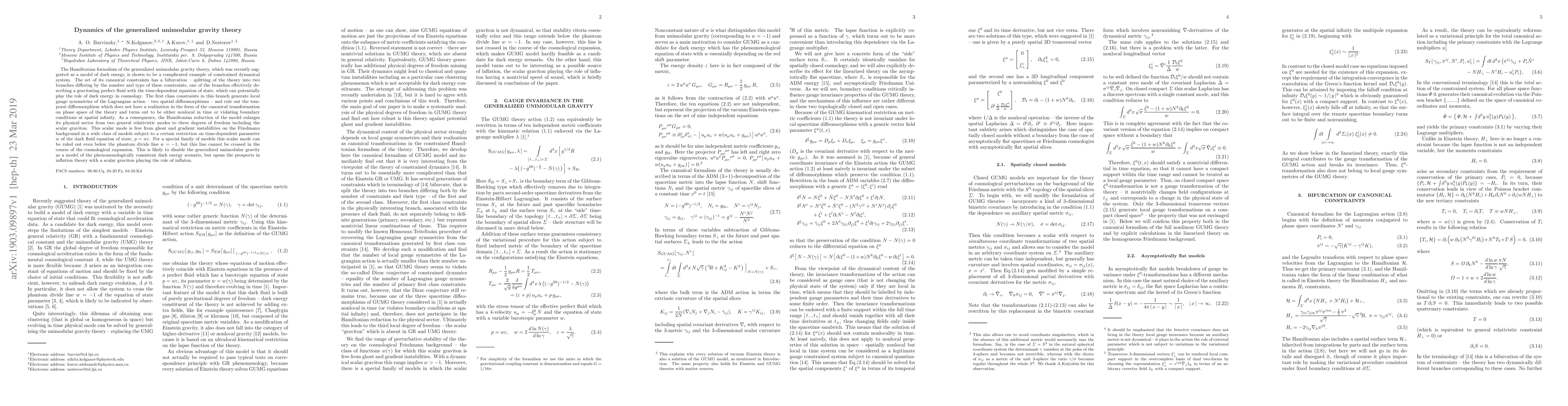 The Hamiltonian formalism of the generalized unimodular gravity theory, which was recently suggested as a model of dark energy, is shown to be a complicated example of constrained dynamical system. The set of its canonical constraints has a bifurcation -- splitting of the theory into two branches differing by the number and type of these constraints, one of the branches effectively describing a gravitating perfect fluid with the time-dependent equation of state, which can potentially play the role of dark energy in cosmology. The first class constraints in this branch generate local gauge symmetries of the Lagrangian action -- two spatial diffeomorphisms -- and rule out the temporal diffeomorphism which does not have a realization in the form of the canonical transformation on phase space of the theory and turns out to be either nonlocal in time or violating boundary conditions at spatial infinity. As a consequence, the Hamiltonian reduction of the model enlarges its physical sector from two general relativistic modes to three degrees of freedom including the scalar graviton. This scalar mode is free from ghost and gradient instabilities on the Friedmann background in a wide class of models subject to a certain restriction on time-dependent parameter $w$ of the dark fluid equation of state, $p=w\varepsilon$. For a special family of models this scalar mode can be ruled out even below the phantom divide line $w=-1$, but this line cannot be crossed in the course of the cosmological expansion. This is likely to disable the generalized unimodular gravity as a model of the phenomenologically consistent dark energy scenario, but opens the prospects in inflation theory with a scalar graviton playing the role of inflaton.