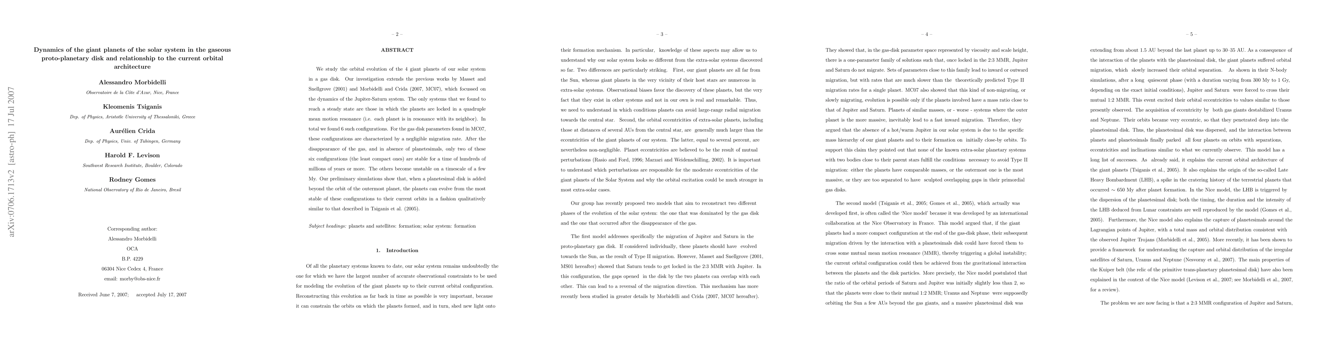 We study the orbital evolution of the 4 giant planets of our solar system in a gas disk. Our investigation extends the previous works by Masset and Snellgrove (2001) and Morbidelli and Crida (2007, MC07), which focussed on the dynamics of the Jupiter-Saturn system. The only systems that we found to reach a steady state are those in which the planets are locked in a quadruple mean motion resonance (i.e. each planet is in resonance with its neighbor). In total we found 6 such configurations. For the gas disk parameters found in MC07, these configurations are characterized by a negligible migration rate. After the disappearance of the gas, and in absence of planetesimals, only two of these six configurations (the least compact ones) are stable for a time of hundreds of millions of years or more. The others become unstable on a timescale of a few My. Our preliminary simulations show that, when a planetesimal disk is added beyond the orbit of the outermost planet, the planets can evolve from the most stable of these configurations to their current orbits in a fashion qualitatively similar to that described in Tsiganis et al. (2005).