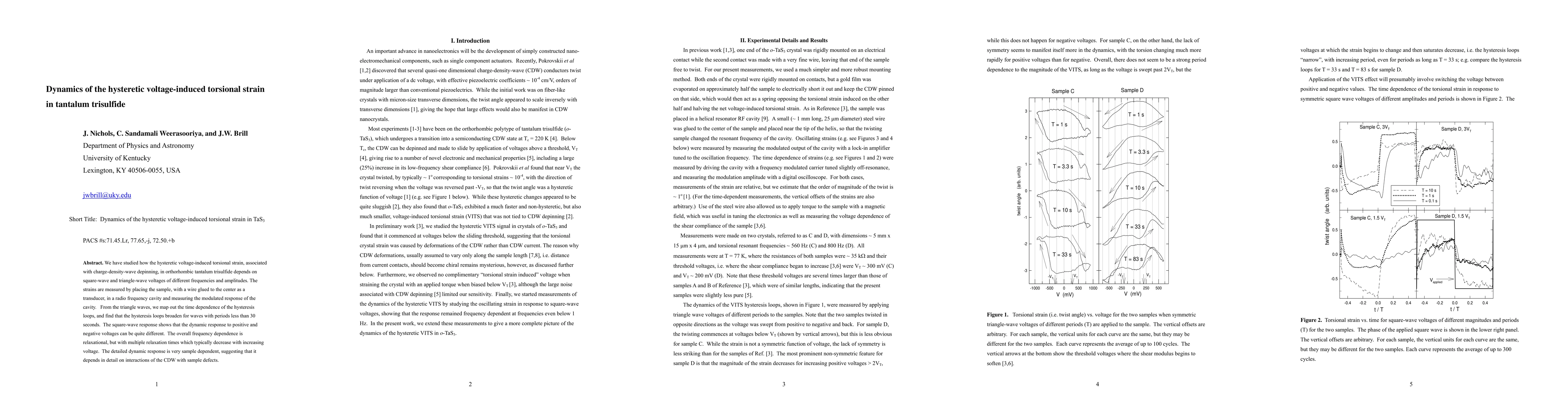 This study investigates the hysteretic voltage-induced torsional strain in tantalum trisulfide, revealing how it varies with different square-wave and triangle-wave voltages. The dynamic response shows relaxational behavior with multiple relaxation times, and is notably sample-dependent, indicating complex interactions between charge-density waves and sample defects.