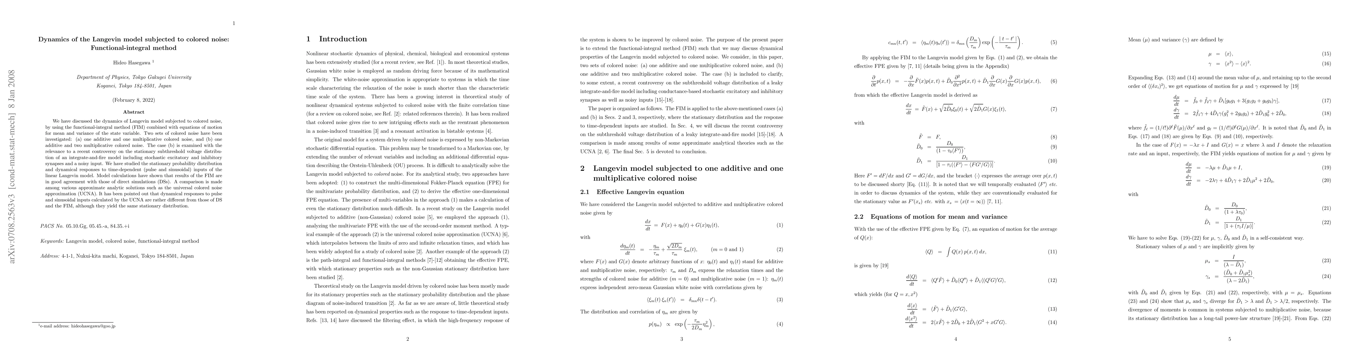 This paper investigates the dynamics of a Langevin model under colored noise using the functional-integral method (FIM), comparing it to direct simulations and other analytic solutions. It examines two sets of colored noise and highlights discrepancies between the universal colored noise approximation and FIM in dynamical responses despite similar stationary distributions.