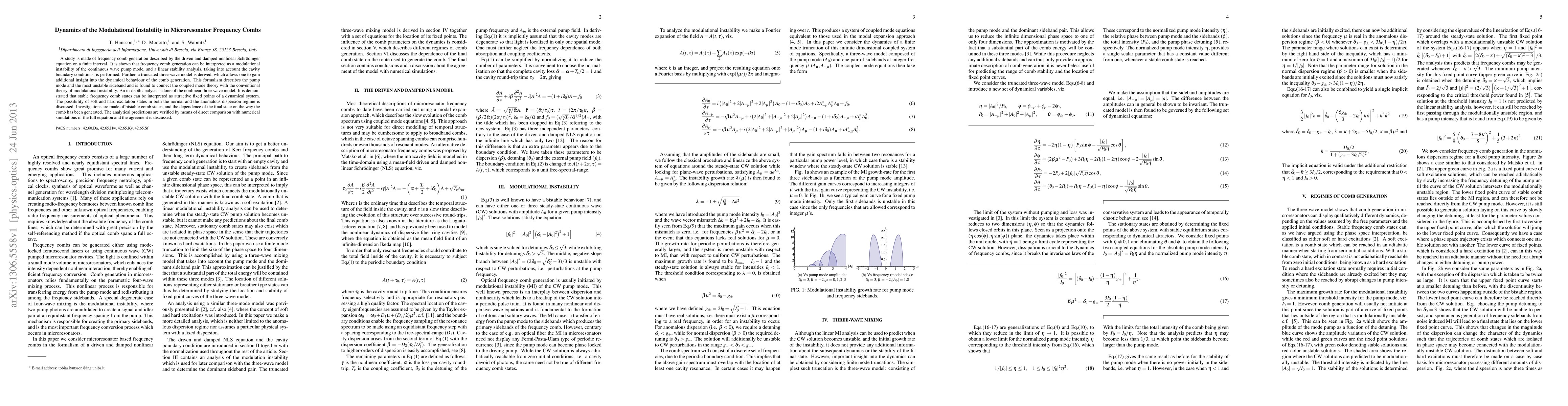 A study is made of frequency comb generation described by the driven and damped nonlinear Schr\"odinger equation on a finite interval. It is shown that frequency comb generation can be interpreted as a modulational instability of the continuous wave pump mode, and a linear stability analysis, taking into account the cavity boundary conditions, is performed. Further, a truncated three-wave model is derived, which allows one to gain additional insight into the dynamical behaviour of the comb generation. This formalism describes the pump mode and the most unstable sideband and is found to connect the coupled mode theory with the conventional theory of modulational instability. An in-depth analysis is done of the nonlinear three-wave model. It is demonstrated that stable frequency comb states can be interpreted as attractive fixed points of a dynamical system. The possibility of soft and hard excitation states in both the normal and the anomalous dispersion regime is discussed. Investigations are made of bistable comb states, and the dependence of the final state on the way the comb has been generated. The analytical predictions are verified by means of direct comparison with numerical simulations of the full equation and the agreement is discussed.