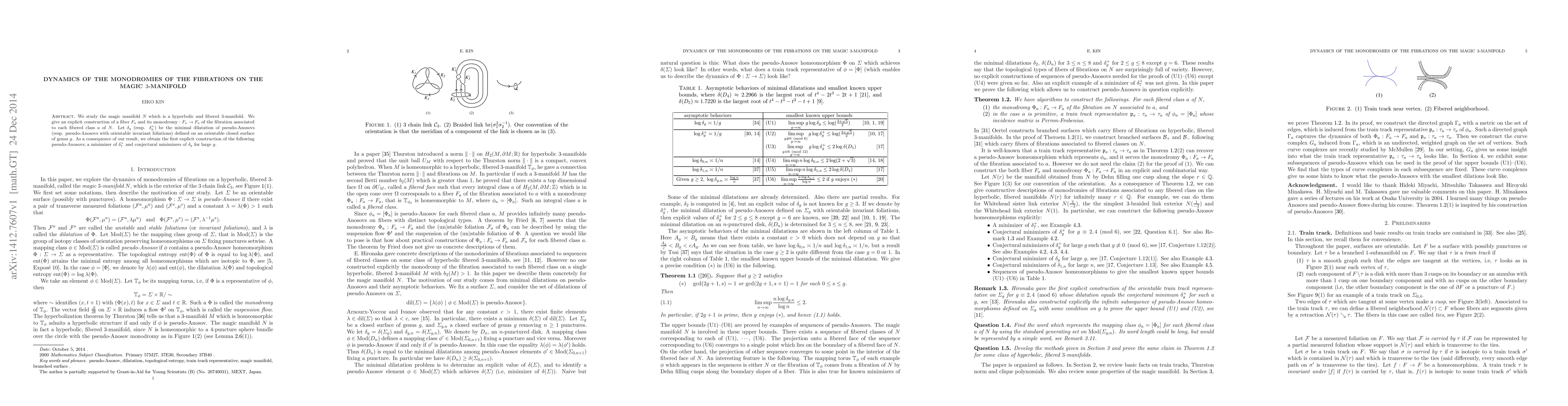 We study the magic manifold $N$ which is a hyperbolic and fibered $3$-manifold. We give an explicit construction of a fiber $F_a$ and its monodromy $:F_a \rightarrow F_a$ of the fibration associated to each fibered class $a$ of $N$. Let $\delta_g$ (resp. $\delta_g^+$) be the minimal dilatation of pseudo-Anosovs (resp. pseudo-Anosovs with orientable invariant foliations) defined on an orientable closed surface of genus $g$. As a consequence of our result, we obtain the first explicit construction of the following pseudo-Anosovs; a minimizer of $\delta_7^+$ and conjectural minimizers of $\delta_g$ for large $g$.