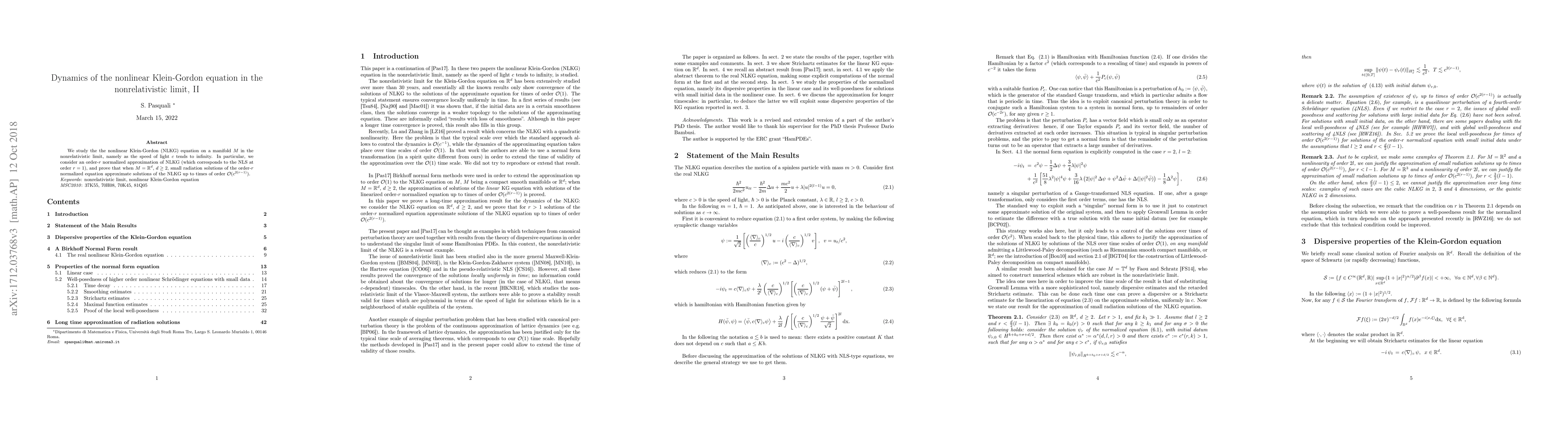 We study the the nonlinear Klein-Gordon (NLKG) equation on a manifold $M$ in the nonrelativistic limit, namely as the speed of light $c$ tends to infinity. In particular, we consider an order-$r$ normalized approximation of NLKG (which corresponds to the NLS at order $r=1$), and prove that when $M=\mathbb{R}^d$, $d \geq 2$, small radiation solutions of the order-$r$ normalized equation approximate solutions of the nonlinear NLKG up to times of order $\mathcal{O}(c^{2(r-1)})$.