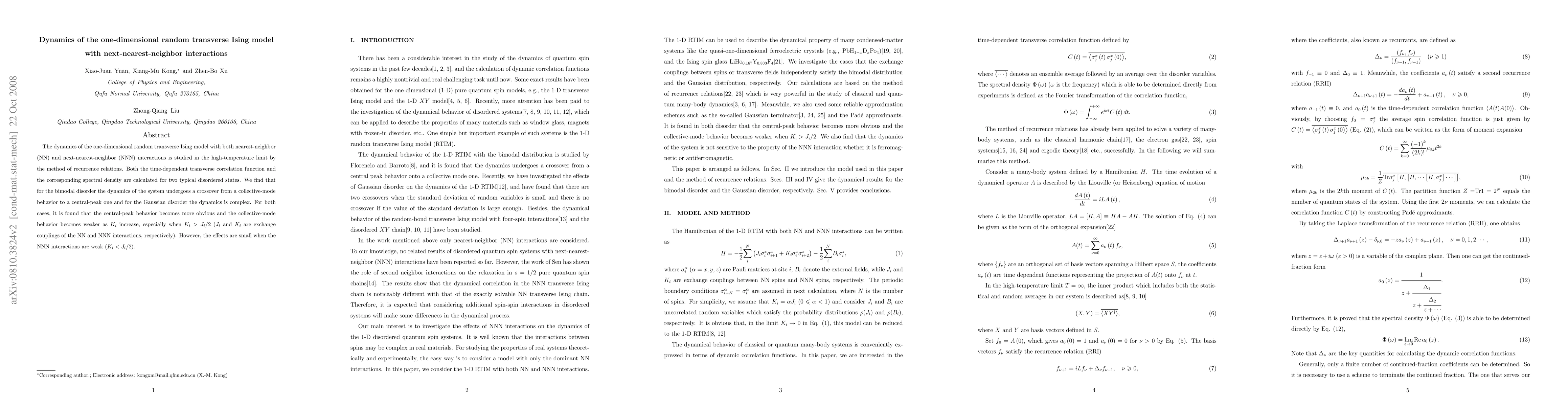 This paper investigates the dynamics of a one-dimensional random transverse Ising model with both nearest-neighbor and next-nearest-neighbor interactions, revealing a crossover in dynamic behavior from collective-mode to central-peak as next-nearest-neighbor interactions increase, especially when they exceed half the nearest-neighbor interactions. The study finds complex dynamics for Gaussian disorder and a more pronounced central-peak behavior for bimodal disorder.