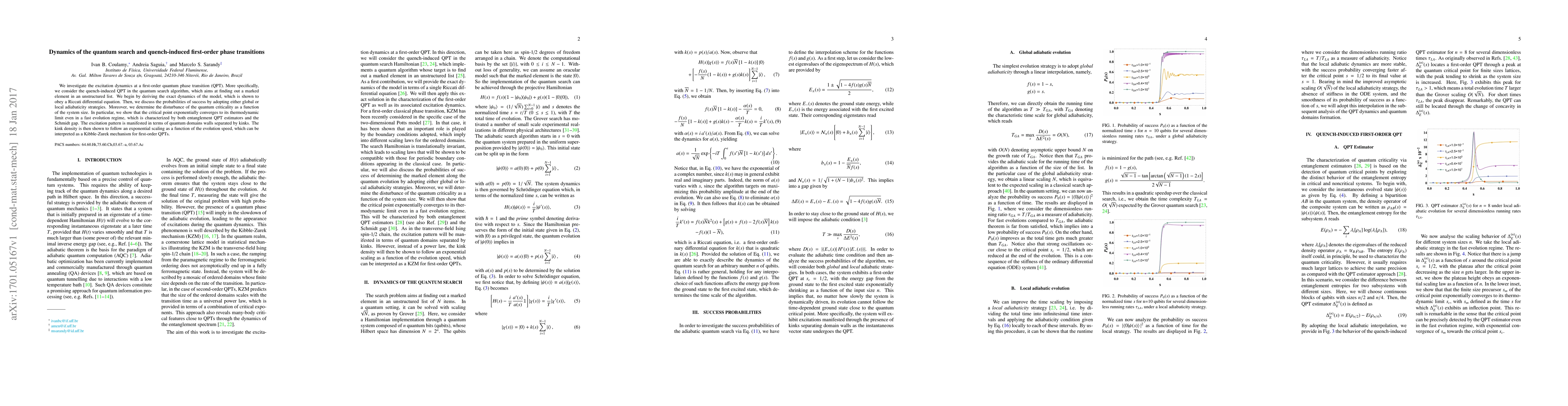We investigate the excitation dynamics at a first-order quantum phase transition (QPT). More specifically, we consider the quench-induced QPT in the quantum search algorithm, which aims at finding out a marked element in an unstructured list. We begin by deriving the exact dynamics of the model, which is shown to obey a Riccati differential equation. Then, we discuss the probabilities of success by adopting either global or local adiabaticity strategies. Moreover, we determine the disturbance of the quantum criticality as a function of the system size. In particular, we show that the critical point exponentially converges to its thermodynamic limit even in a fast evolution regime, which is characterized by both entanglement QPT estimators and the Schmidt gap. The excitation pattern is manifested in terms of quantum domains walls separated by kinks. The kink density is then shown to follow an exponential scaling as a function of the evolution speed, which can be interpreted as a Kibble-Zurek mechanism for first-order QPTs.