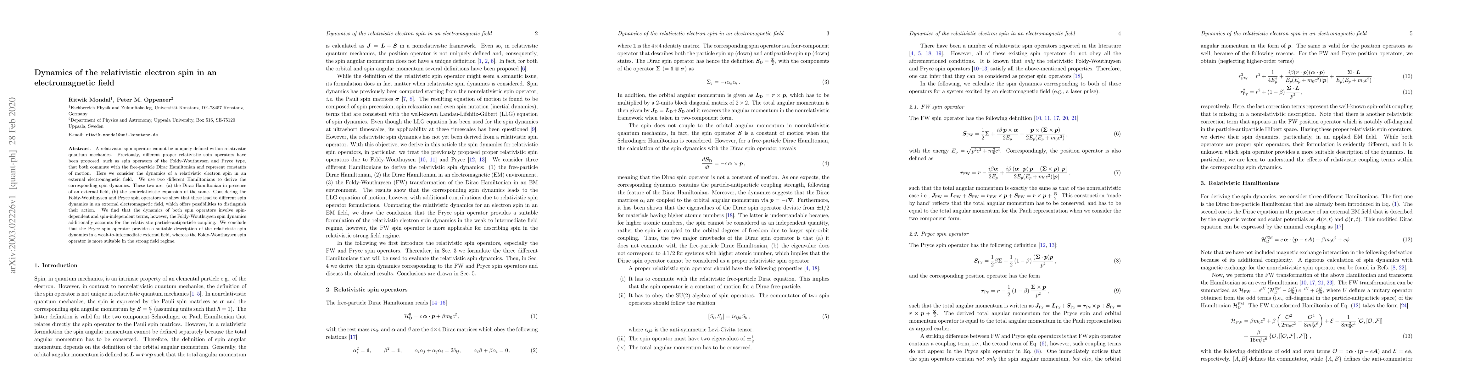 This paper investigates the dynamics of a relativistic electron spin in an electromagnetic field using two Hamiltonians and different spin operators. It finds that the Foldy-Wouthuysen and Pryce spin operators lead to distinct spin dynamics, with Pryce being more suitable for weak-to-intermediate fields and Foldy-Wouthuysen for strong fields due to its consideration of particle-antiparticle coupling.