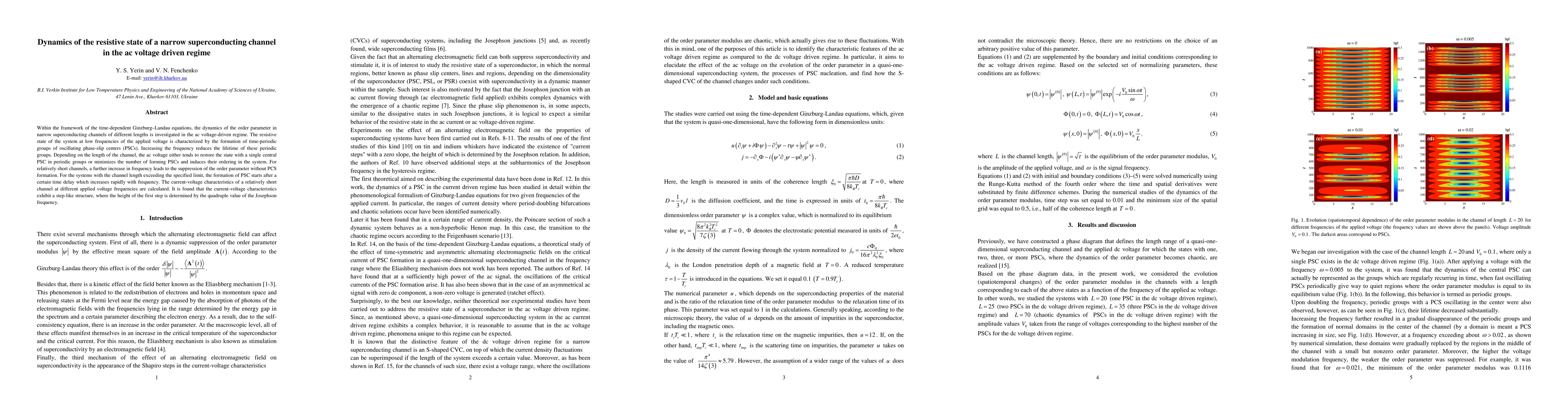 This paper investigates the dynamics of order parameters in narrow superconducting channels under ac voltage, revealing the formation of time-periodic phase-slip centers at low frequencies. The study finds that higher frequencies reduce the lifetime of these centers and influence the number and ordering of slip centers based on channel length.
