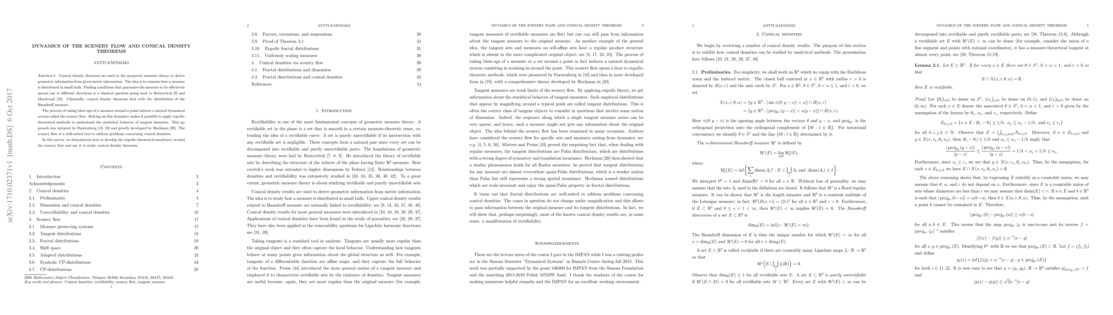 Conical density theorems are used in the geometric measure theory to derive geometric information from given metric information. The idea is to examine how a measure is distributed in small balls. Finding conditions that guarantee the measure to be effectively spread out in different directions is a classical question going back to Besicovitch (1938) and Marstrand (1954). Classically, conical density theorems deal with the distribution of the Hausdorff measure. The process of taking blow-ups of a measure around a point induces a natural dynamical system called the scenery flow. Relying on this dynamics makes it possible to apply ergodic-theoretical methods to understand the statistical behavior of tangent measures. This approach was initiated by Furstenberg (1970, 2008) and greatly developed by Hochman (2010). The scenery flow is a well-suited tool to address problems concerning conical densities. In this survey, we demonstrate how to develop the ergodic-theoretical machinery around the scenery flow and use it to study conical density theorems.