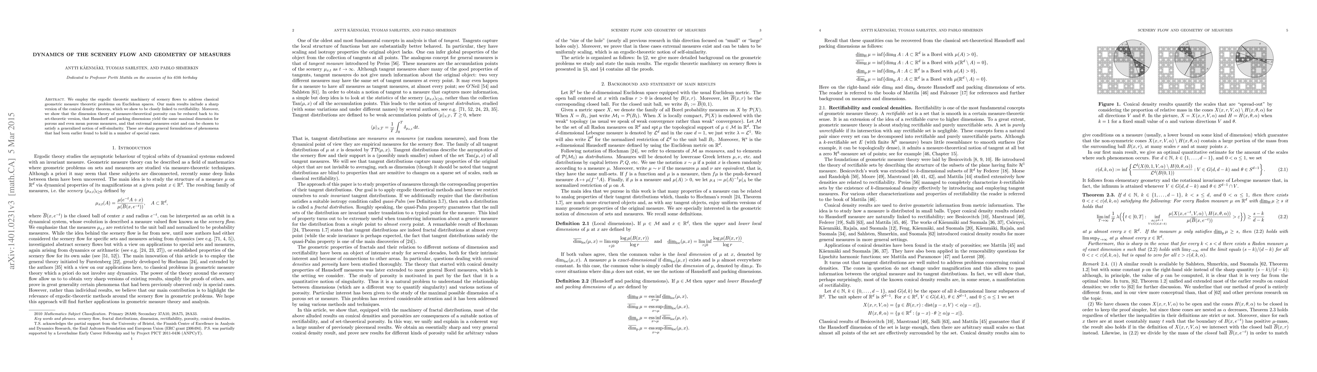 We employ the ergodic theoretic machinery of scenery flows to address classical geometric measure theoretic problems on Euclidean spaces. Our main results include a sharp version of the conical density theorem, which we show to be closely linked to rectifiability. Moreover, we show that the dimension theory of measure-theoretical porosity can be reduced back to its set-theoretic version, that Hausdorff and packing dimensions yield the same maximal dimension for porous and even mean porous measures, and that extremal measures exist and can be chosen to satisfy a generalized notion of self-similarity. These are sharp general formulations of phenomena that had been earlier found to hold in a number of special cases.