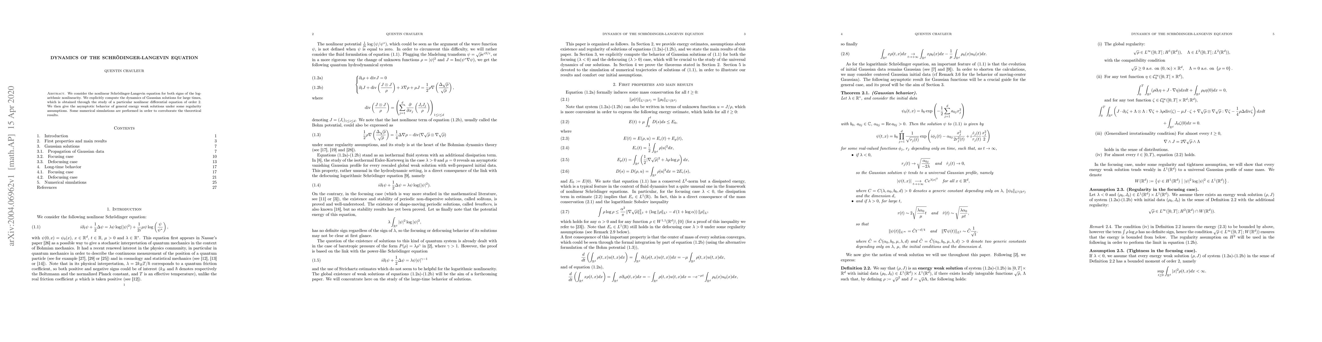 This paper investigates the dynamics of Gaussian solutions to the nonlinear Schrödinger-Langevin equation, deriving asymptotic behaviors for general energy weak solutions under regularity assumptions. Numerical simulations support the theoretical findings.