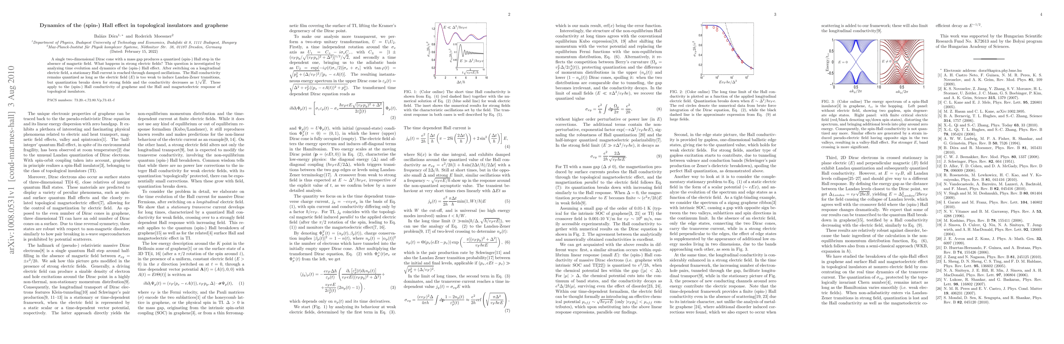 This paper investigates the dynamics of the (spin-) Hall effect in topological insulators and graphene under strong electric fields, finding that while the Hall conductivity remains quantized for weak fields, it breaks down and decreases as 1/sqrt{E} for strong fields.