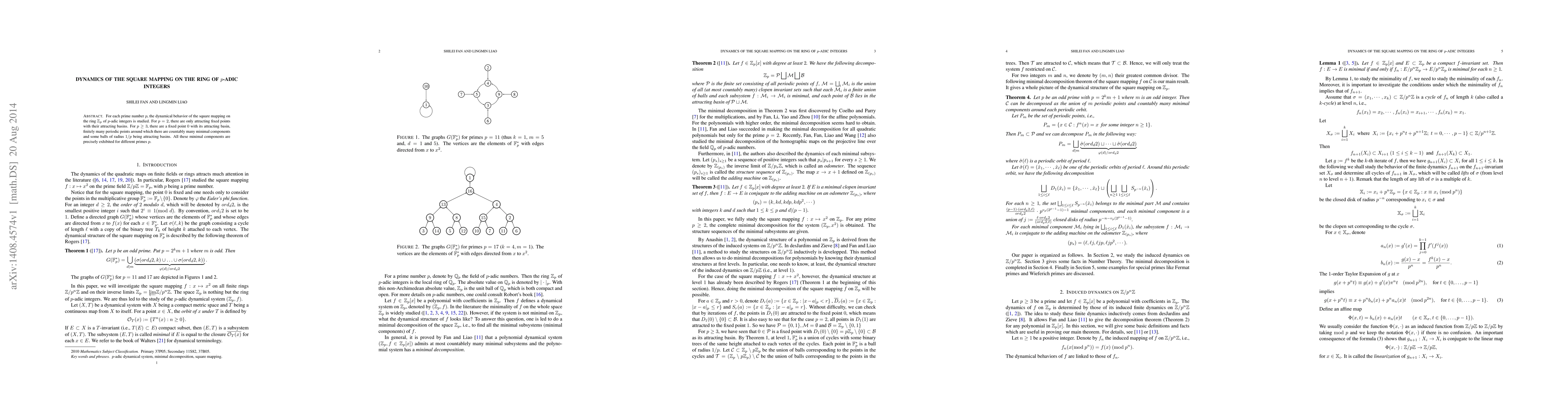 This paper examines the dynamics of the squaring map on the $p$-adic integers $\mathbb{Z}_p$ for various primes $p$. For $p=2$, the map has only attracting fixed points, while for $p\geq 3$, it features a fixed point $0$, periodic points, and minimal components, with attracting basins of radius $1/p$.
