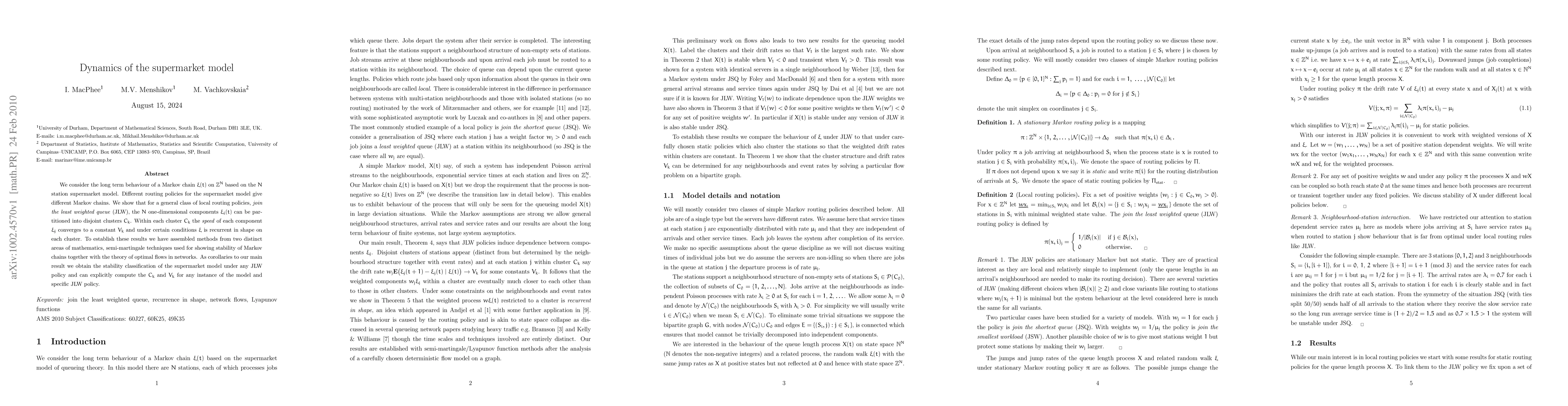 We consider the long term behaviour of a Markov chain \xi(t) on \Z^N based on the N station supermarket model. Different routing policies for the supermarket model give different Markov chains. We show that for a general class of local routing policies, "join the least weighted queue" (JLW), the N one-dimensional components \xi_i(t) can be partitioned into disjoint clusters C_k. Within each cluster C_k the "speed" of each component \xi_j converges to a constant V_k and under certain conditions \xi is recurrent in shape on each cluster. To establish these results we have assembled methods from two distinct areas of mathematics, semi-martingale techniques used for showing stability of Markov chains together with the theory of optimal flows in networks. As corollaries to our main result we obtain the stability classification of the supermarket model under any JLW policy and can explicitly compute the C_k and V_k for any instance of the model and specific JLW policy.