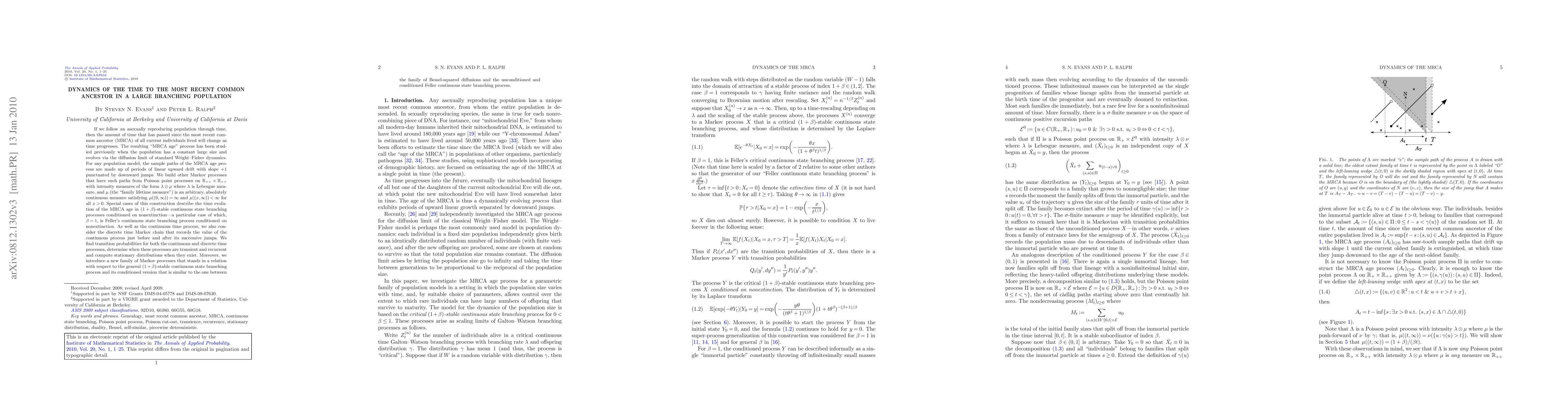 This paper studies the dynamics of the time to the most recent common ancestor (MRCA) in large branching populations, focusing on both continuous and discrete time Markov processes. It constructs these processes from Poisson point processes and analyzes their transition probabilities, recurrence, and stationary distributions.