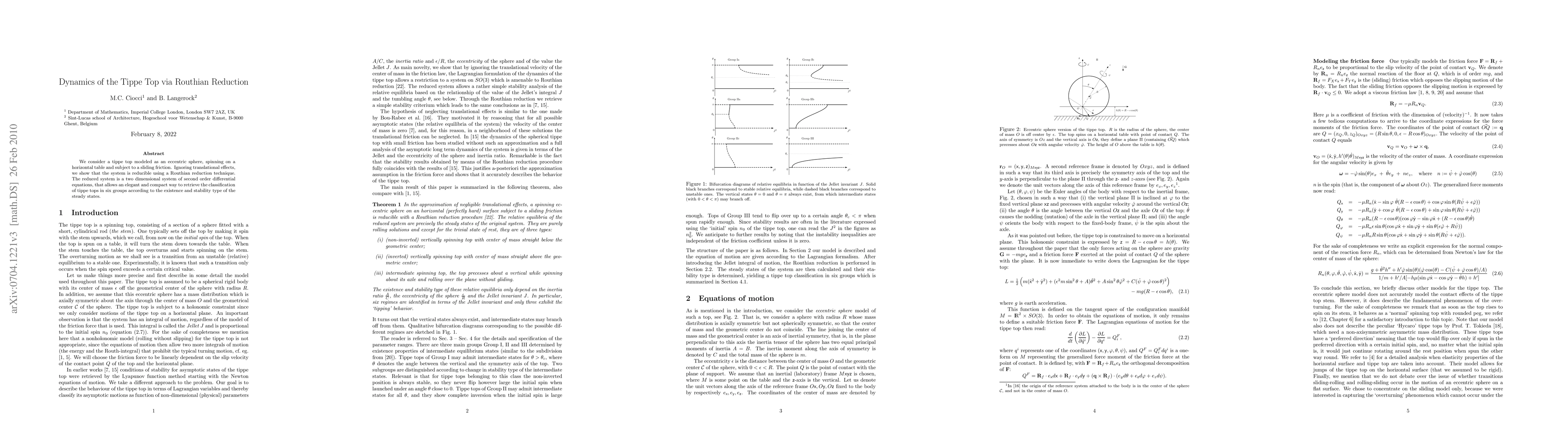 This paper explores the dynamics of a tippe top modeled as an eccentric spinning sphere on a table with sliding friction, demonstrating its reduction via Routhian technique to a two-dimensional system of second-order differential equations. This simplified model elegantly classifies tippe tops into six groups based on steady state stability.