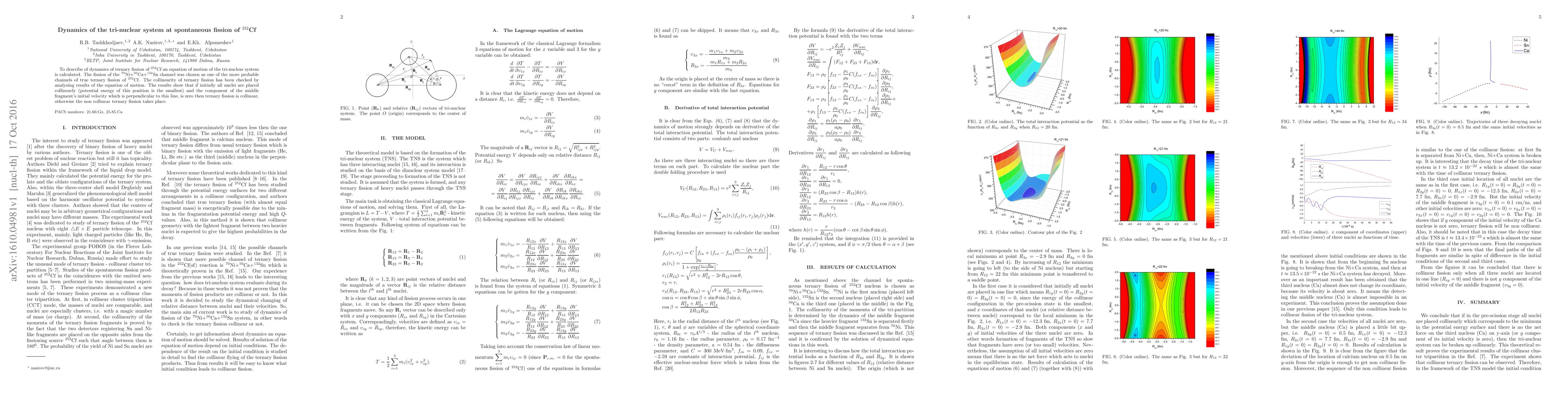 To describe of dynamics of ternary fission of $^{252}$Cf an equation of motion of the tri-nuclear system is calculated. The fission of the $^{70}$Ni+$^{50}$Ca+$^{132}$Sn channel was chosen as one of the more probable channels of true ternary fission of $^{252}$Cf. The collinearity of ternary fission has been checked by analyzing results of the equation of motion. The results show that if initially all nuclei are placed collinearly (potential energy of this position is the smallest) and the component of the middle fragment's initial velocity which is perpendicular to this line, is zero then ternary fission is collinear, otherwise the non collinear ternary fission takes place.