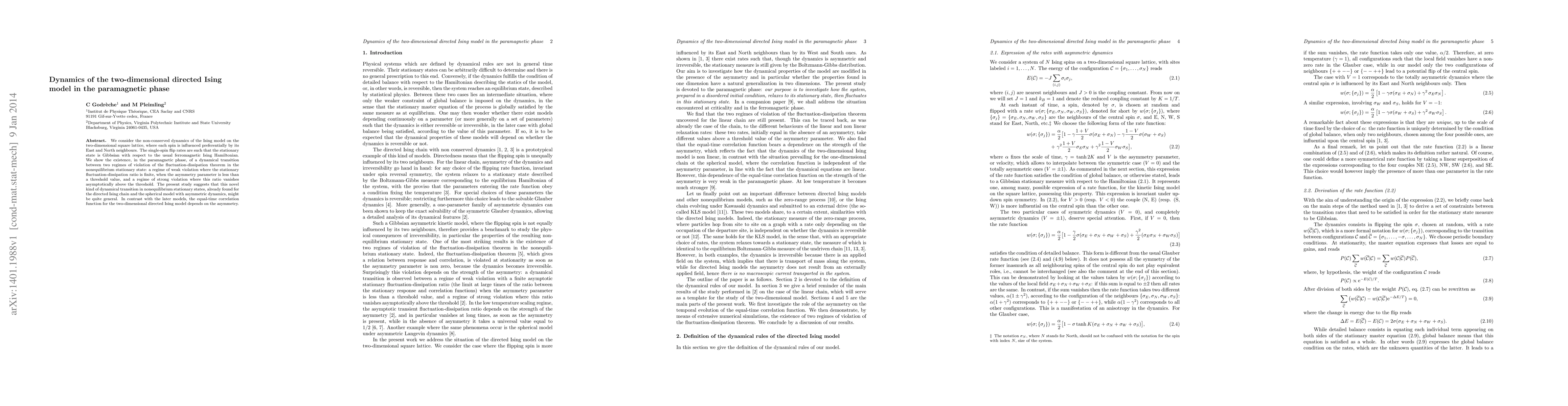 This paper investigates the dynamics of the two-dimensional directed Ising model in the paramagnetic phase, revealing a dynamical transition between regimes of weak and strong violation of the fluctuation-dissipation theorem in nonequilibrium stationary states. Unlike the directed Ising chain and spherical model, the equal-time correlation function here depends on the asymmetry parameter.