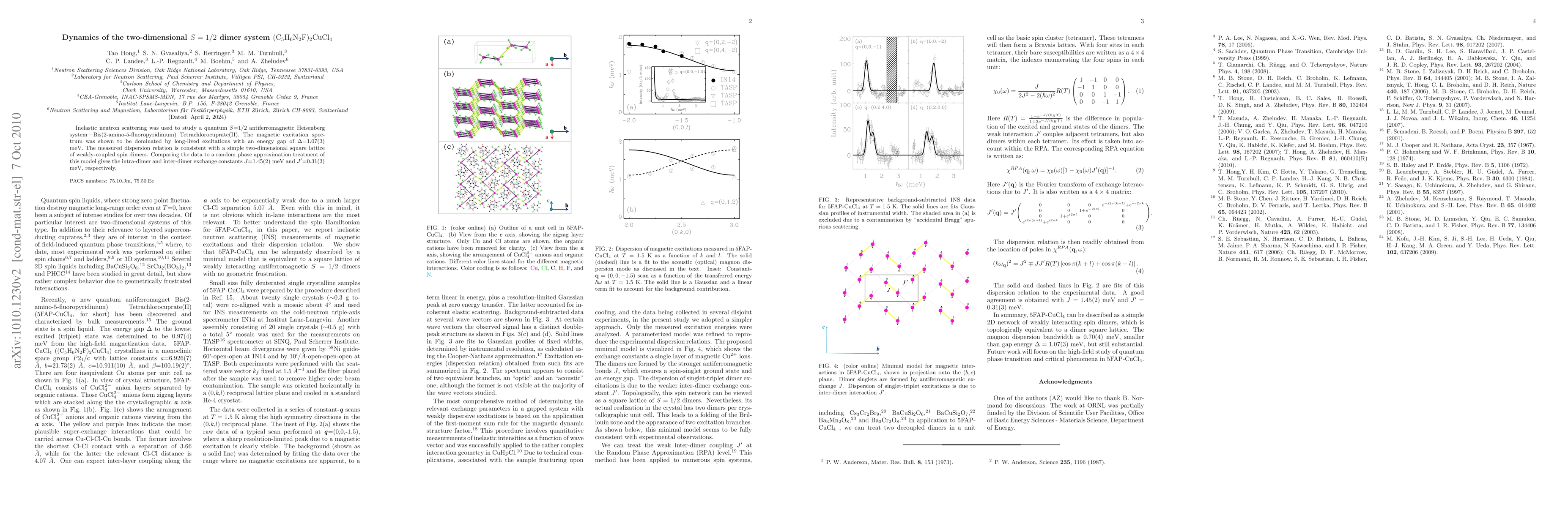 Inelastic neutron scattering was used to study a quantum S=1/2 antiferromagnetic Heisenberg system-Bis(2-amino-5-fluoropyridinium) Tetrachlorocuprate(II). The magnetic excitation spectrum was shown to be dominated by long-lived excitations with an energy gap as 1.07(3) meV. The measured dispersion relation is consistent with a simple two-dimensional square lattice of weakly-coupled spin dimers. Comparing the data to a random phase approximation treatment of this model gives the intra-dimer and inter-dimer exchange constants J=1.45(2) meV and J'=0.31(3) meV, respectively.