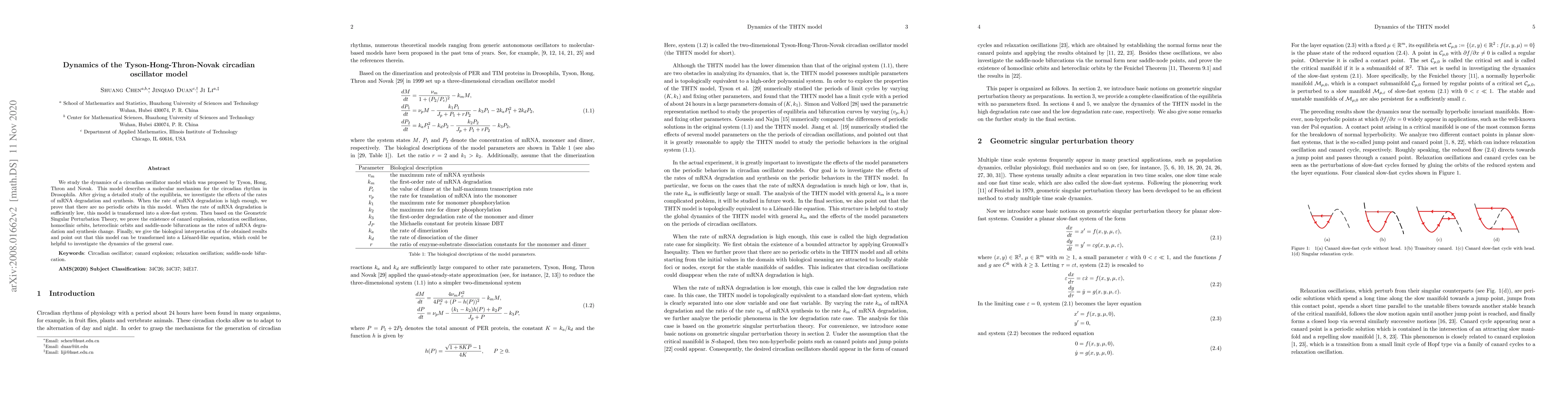We study the dynamics of a circadian oscillator model which was proposed by Tyson, Hong, Thron and Novak. This model indicates a molecular mechanism for the circadian rhythm in Drosophila. After giving a detailed study of the equilibria, we further investigate the effects of the rates of mRNA degradation and synthesis. When the rate of mRNA degradation is rather fast, we prove that there are no periodic orbits in this model. When the rate of mRNA degradation is slow enough, this model is transformed into a slow-fast system. Then based on the geometric singular perturbation theory, we prove the existence of canard explosion, relaxation oscillations, homoclinic/heteroclinic orbits and saddle-node bifurcations as the rates of mRNA degradation and synthesis change. Finally, we give the biological interpretation of the obtained results and point out that this model can be transformed into a Li\'enard-like equation, which could be helpful to investigate the dynamics of the general case.