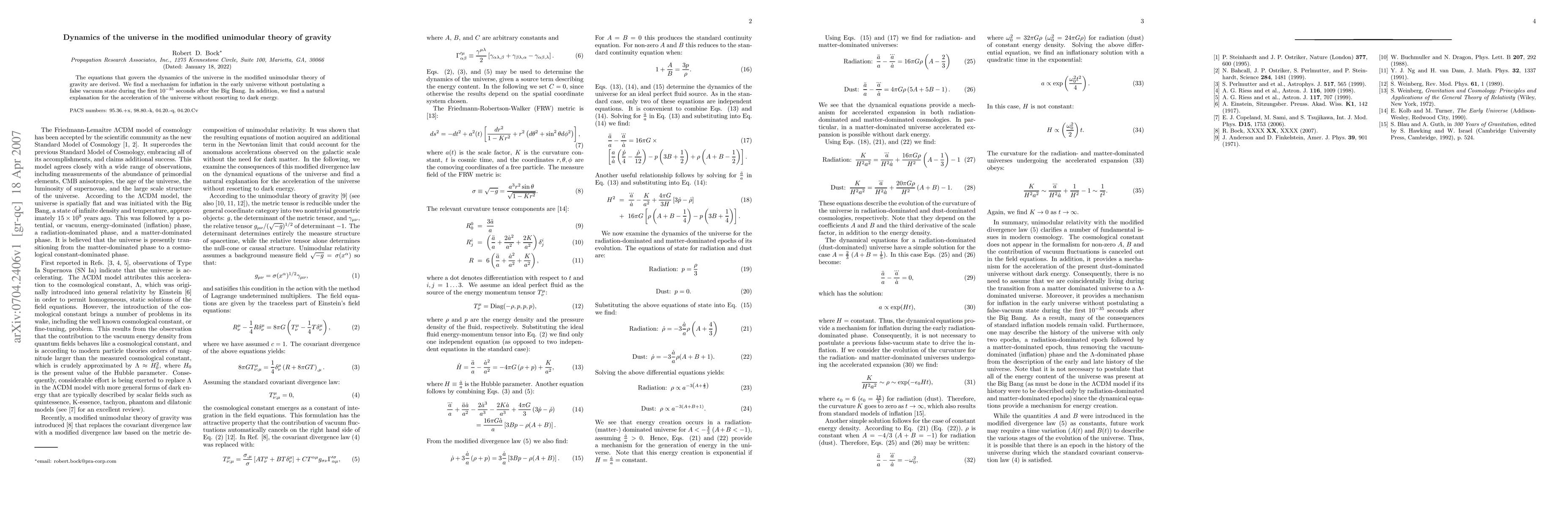 The equations that govern the dynamics of the universe in the modified unimodular theory of gravity are derived. We find a mechanism for inflation in the early universe without postulating a false vacuum state during the first $10^{-35}$ seconds after the Big Bang. In addition, we find a natural explanation for the acceleration of the universe without resorting to dark energy.