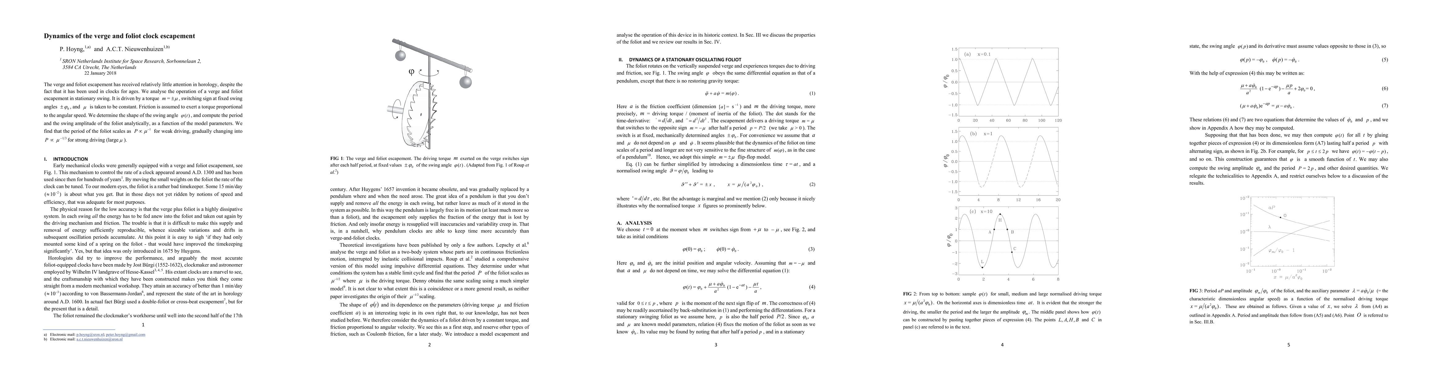 This paper analyzes the dynamics of the verge and foliot clock escapement, determining its swing angle and period analytically. It finds that the period scales inversely with the driving torque for weak driving, transitioning to an inverse cubic relationship for strong driving.