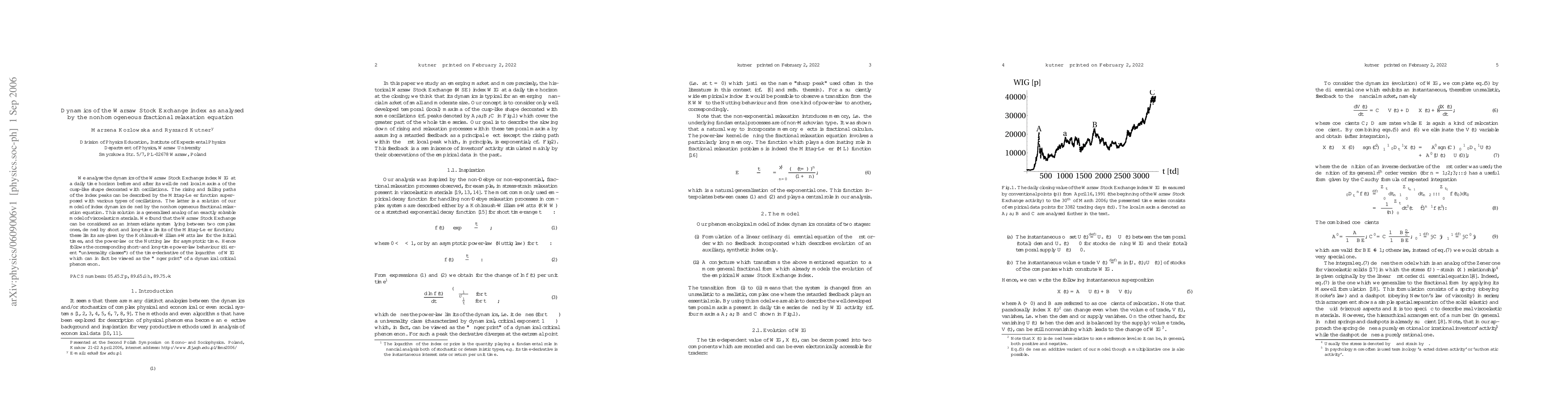 We analyse the dynamics of the Warsaw Stock Exchange index WIG at a daily time horizon before and after its well defined local maxima of the cusp-like shape decorated with oscillations. The rising and falling paths of the index peaks can be described by the Mittag-Leffler function superposed with various types of oscillations. The latter is a solution of our model of index dynamics defined by the nonhomogeneous fractional relaxation equation. This solution is a generalised analog of an exactly solvable model of viscoelastic materials. We found that the Warsaw Stock Exchange can be considered as an intermediate system lying between two complex ones, defined by short and long-time limits of the Mittag-Leffler function; these limits are given by the Kohlraush-Williams-Watts law for the initial times, and the power-law or the Nutting law for asymptotic time. Hence follows the corresponding short- and long-time power-law behaviour (different universality classes) of the time-derivative of the logarithm of WIG which can in fact be viewed as the finger print of a dynamical critical phenomenon.