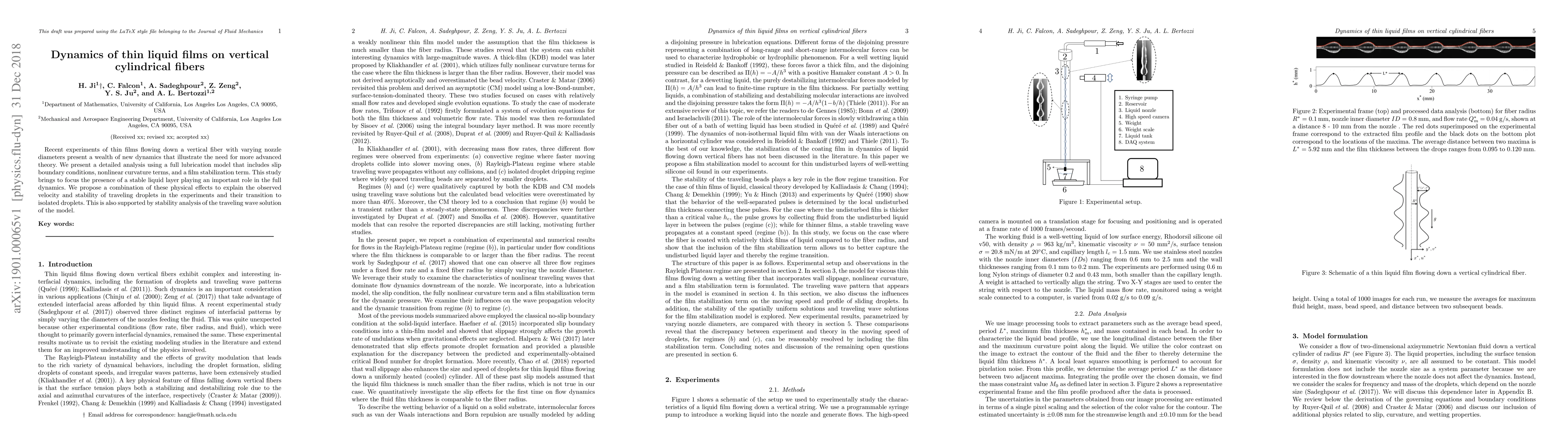 This paper analyzes the dynamics of thin liquid films on vertical cylindrical fibers using a full lubrication model, revealing the importance of slip boundary conditions, curvature effects, and film stabilization. It proposes a comprehensive theory to explain the observed behavior of traveling droplets and their transition to isolated droplets, supported by stability analysis.
