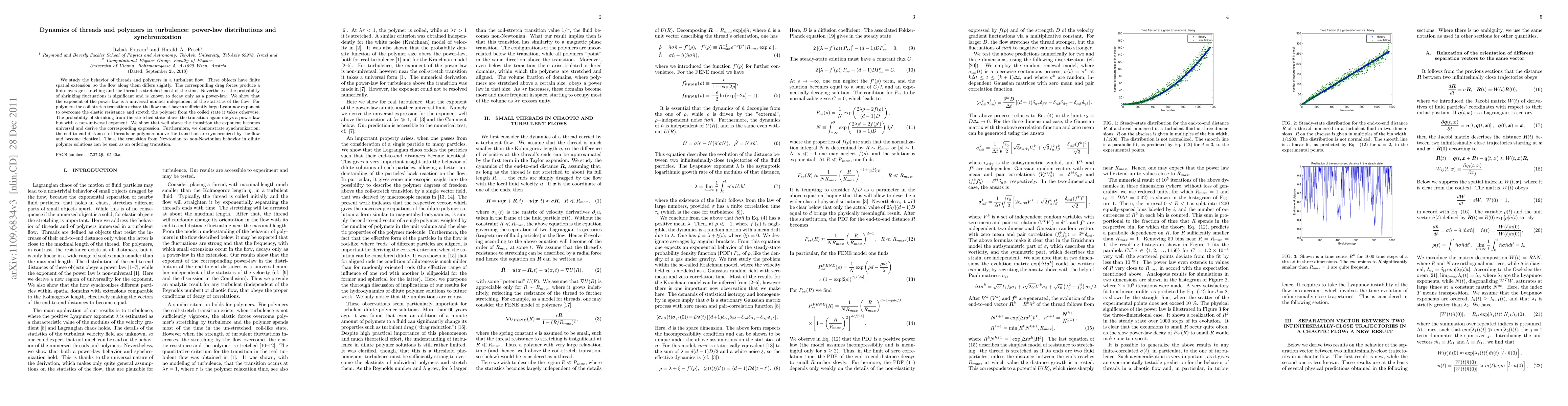 This paper studies the behavior of threads and polymers in turbulent flows, revealing power-law distributions for stretching fluctuations and synchronization above a transition point, which can explain non-Newtonian behavior in polymer solutions.