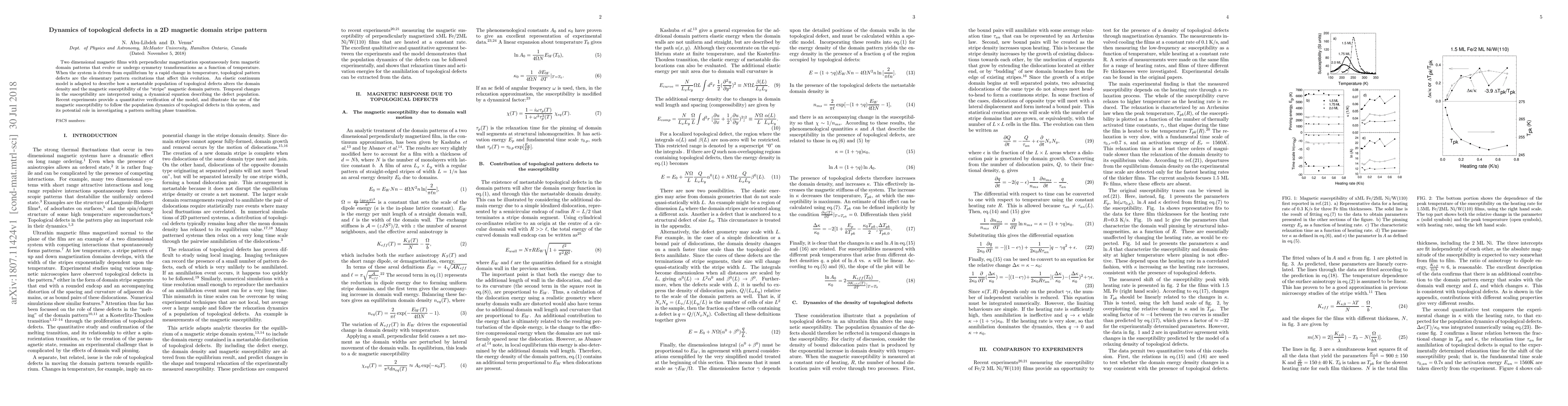 Two dimensional magnetic films with perpendicular magnetization spontaneously form magnetic domain patterns that evolve or undergo symmetry transformations as a function of temperature. When the system is driven from equilibrium by a rapid change in temperature, topological pattern defects are the elementary pattern excitations that affect this evolution. An elastic continuum model is adapted to describe how a metastable population of topological defects alters the domain density and the magnetic susceptibility of the "stripe" magnetic domain pattern. Temporal changes in the susceptibility are interpreted using a dynamical equation describing the defect population. Recent experiments provide a quantitative verification of the model, and illustrate the use of the magnetic susceptibility to follow the population dynamics of topological defects in this system, and its potential role in investigating a pattern melting phase transition.