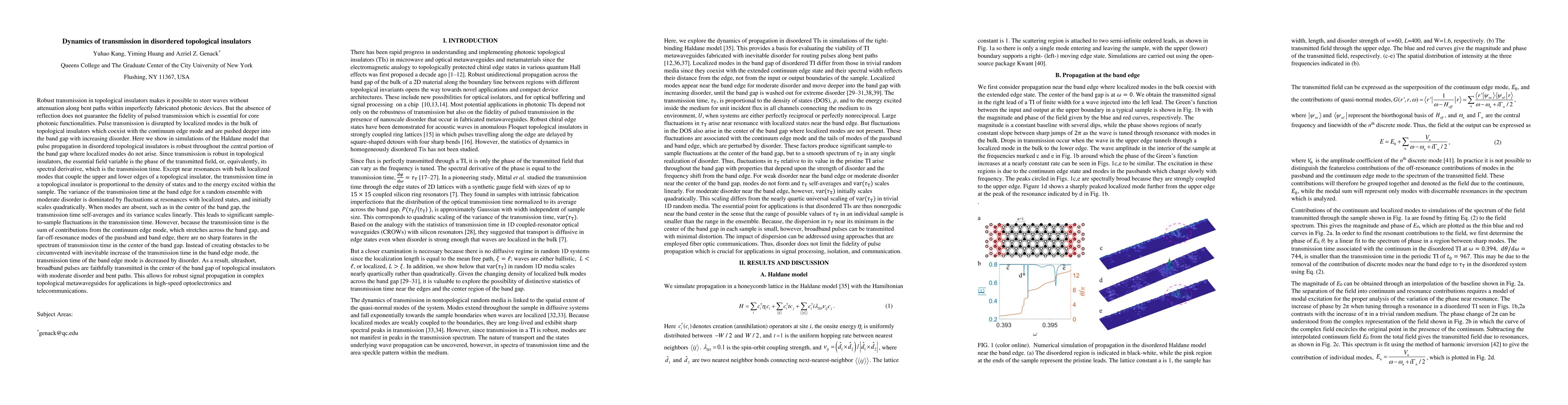 Here we show in simulations of the Haldane model that pulse propagation in disordered topological insulators is robust throughout the central portion of the band gap where localized modes do not arise. Since transmission is robust in topological insulators, the essential field variable is the phase of the transmitted field, or, equivalently, its spectral derivative, which is the transmission time. Except near resonances with bulk localized modes that couple the upper and lower edges of a topological insulator, the transmission time in a topological insulator is proportional to the density of states and to the energy excited within the sample. The average transmission time is enhanced in disordered TIs near the band edge and slightly suppressed in the center of the band gap. The variance of the transmission time at the band edge for a random ensemble with moderate disorder is dominated by fluctuations at resonances with localized states, and initially scales quadratically. When modes are absent, such as in the center of the band gap, the transmission time self-averages and its variance scales linearly. This leads to significant sample-to-sample fluctuations in the transmission time. However, because the transmission time is the sum of contributions from the continuum edge mode, which stretches across the band gap, and far-off-resonance modes near the band edge, there are no sharp features in the spectrum of transmission time in the center of the band gap. As a result, ultrashort, broadband pulses are faithfully transmitted in the center of the band gap of topological insulators with moderate disorder and bent paths. This allows for robust signal propagation in complex topological metawaveguides for applications in high-speed optoelectronics and telecommunications.