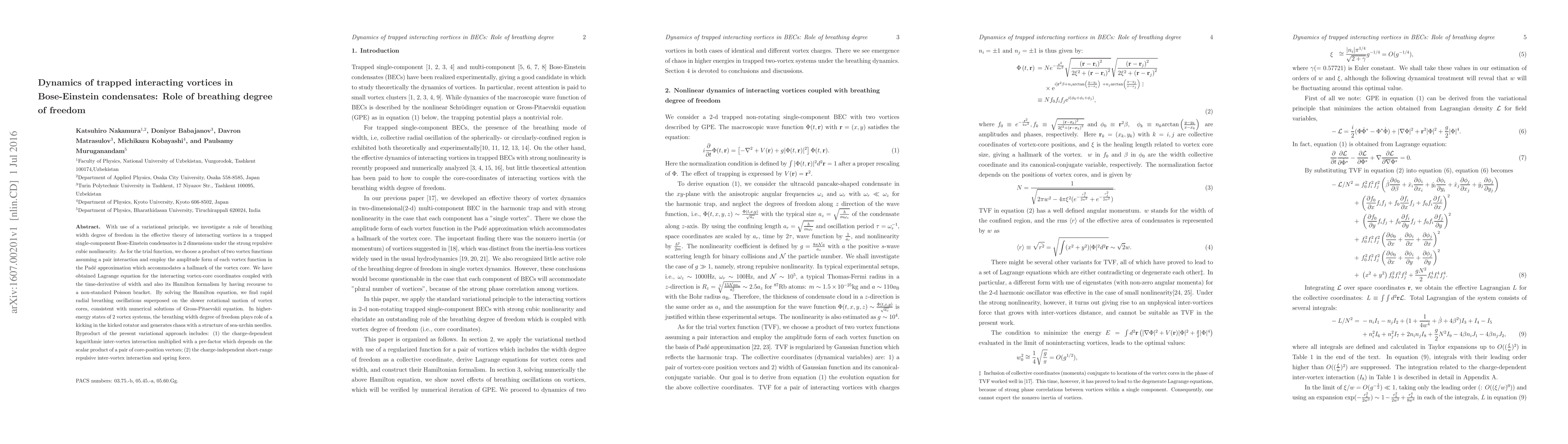 With use of a variational principle, we investigate a role of breathing width degree of freedom in the effective theory of interacting vortices in a trapped single-component Bose-Einstein condensates in 2 dimensions under the strong repulsive cubic nonlinearity. As for the trial function, we choose a product of two vortex functions assuming a pair interaction and employ the amplitude form of each vortex function in the Pad\'e approximation which accommodates a hallmark of the vortex core. We have obtained Lagrange equation for the interacting vortex-core coordinates coupled with the time-derivative of width and also its Hamilton formalism by having recourse to a non-standard Poisson bracket. By solving the Hamilton equation, we find rapid radial breathing oscillations superposed on the slower rotational motion of vortex cores, consistent with numerical solutions of Gross-Pitaevskii equation. In higher-energy states of 2 vortex systems, the breathing width degree of freedom plays role of a kicking in the kicked rotator and generates chaos with a structure of sea-urchin needles. Byproduct of the present variational approach includes: (1) the charge-dependent logarithmic inter-vortex interaction multiplied with a pre-factor which depends on the scalar product of a pair of core-position vectors; (2) the charge-independent short-range repulsive inter-vortex interaction and spring force.