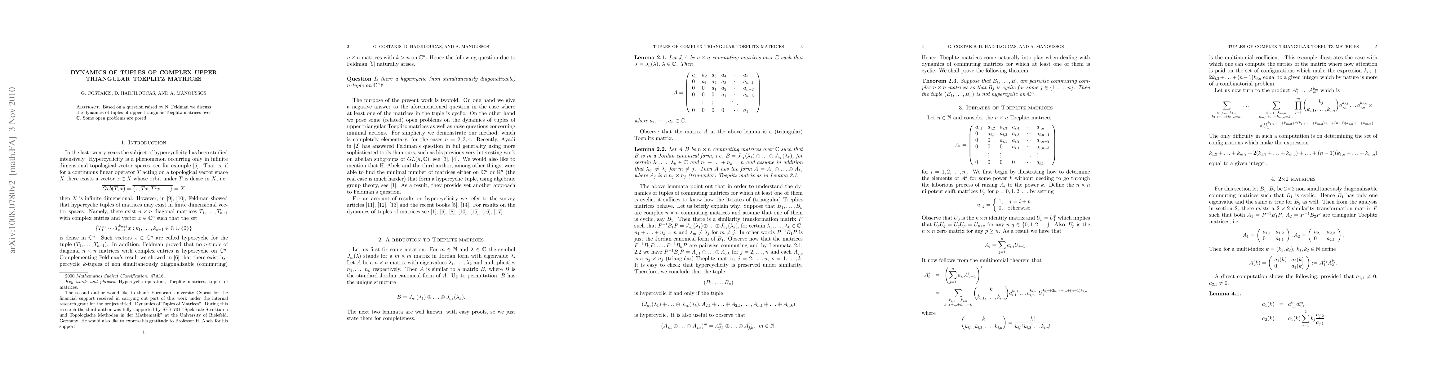 Summary: This paper explores the dynamics of tuples of complex upper triangular Toeplitz matrices, addressing a question by N. Feldman and posing new open problems in this mathematical area.