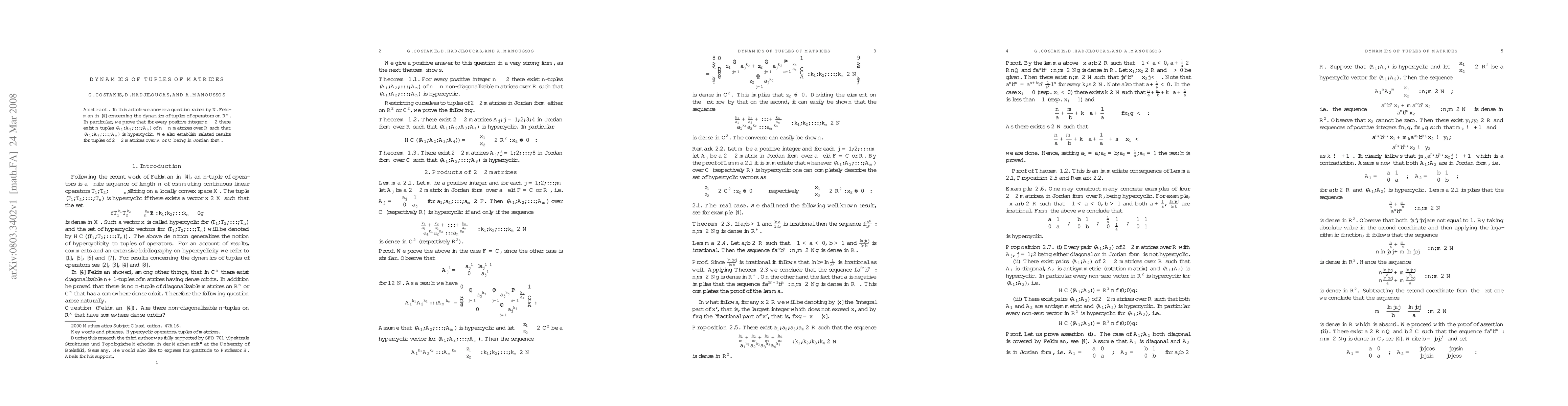 The paper addresses the dynamics of tuples of matrices, proving the existence of $n$ hypercyclic $n \times n$ matrix tuples for any $n \geq 2$. It also explores related results for $2 \times 2$ matrices in Jordan form over $\mathbb{R}$ or $\mathbb{C}$.