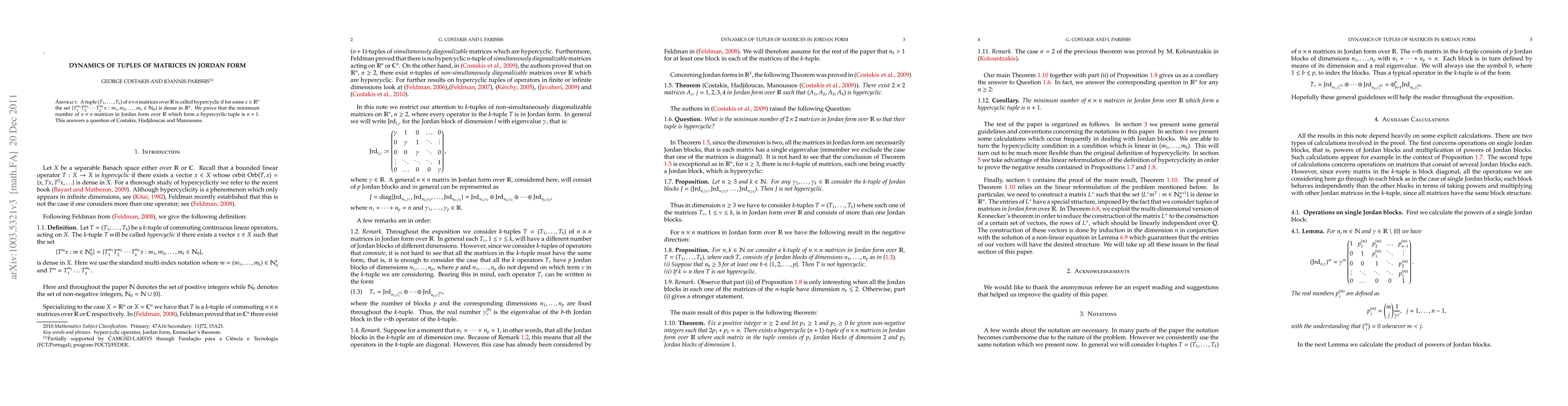 This paper investigates hypercyclic tuples of matrices in Jordan form and proves that the minimum number of such matrices needed to create a hypercyclic tuple is n+1 for n x n matrices, resolving a query by Costakis, Hadjiloucas, and Manoussos.