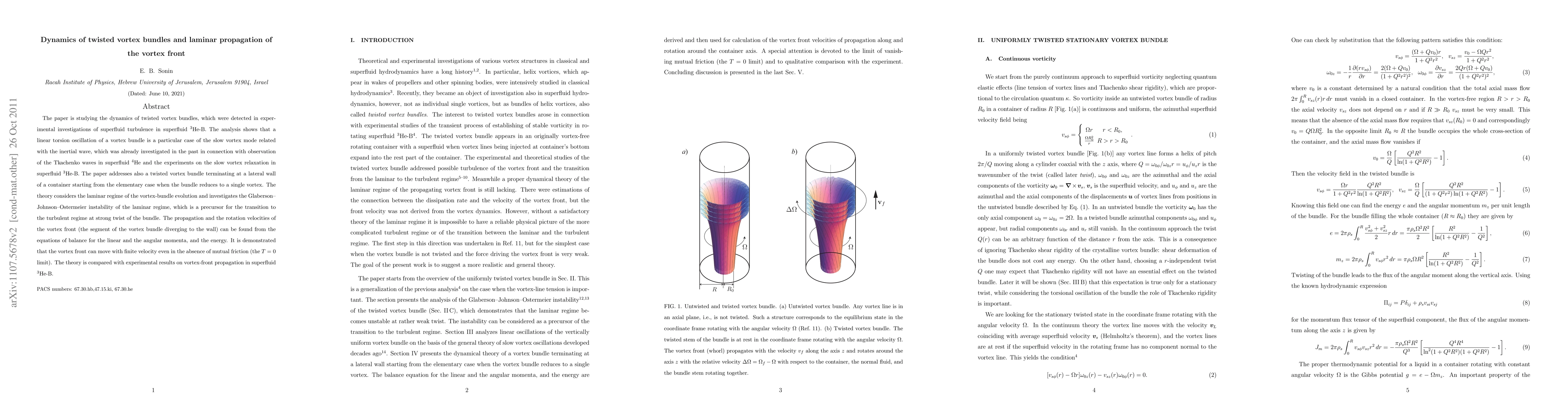 This paper explores the dynamics of twisted vortex bundles in superfluid 3He-B, identifying their linear torsion oscillation as a slow vortex mode linked to inertial waves. It also investigates the laminar propagation of vortex fronts and the Glaberson-Johnson-Ostermeier instability, predicting finite vortex-front velocities even in the absence of mutual friction, and compares theoretical findings with experimental observations.