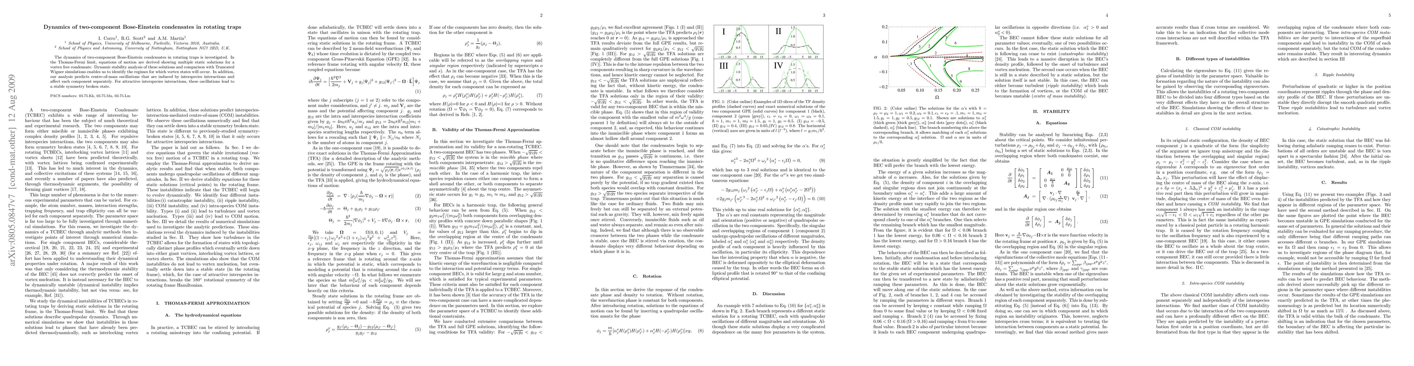 This paper investigates the dynamics of two-component Bose-Einstein condensates in rotating traps, deriving equations of motion and identifying multiple static solutions. The study reveals dynamic stability and predicts vortex formation and center-of-mass oscillations influenced by interspecies interactions, leading to stable symmetry broken states for attractive interactions.