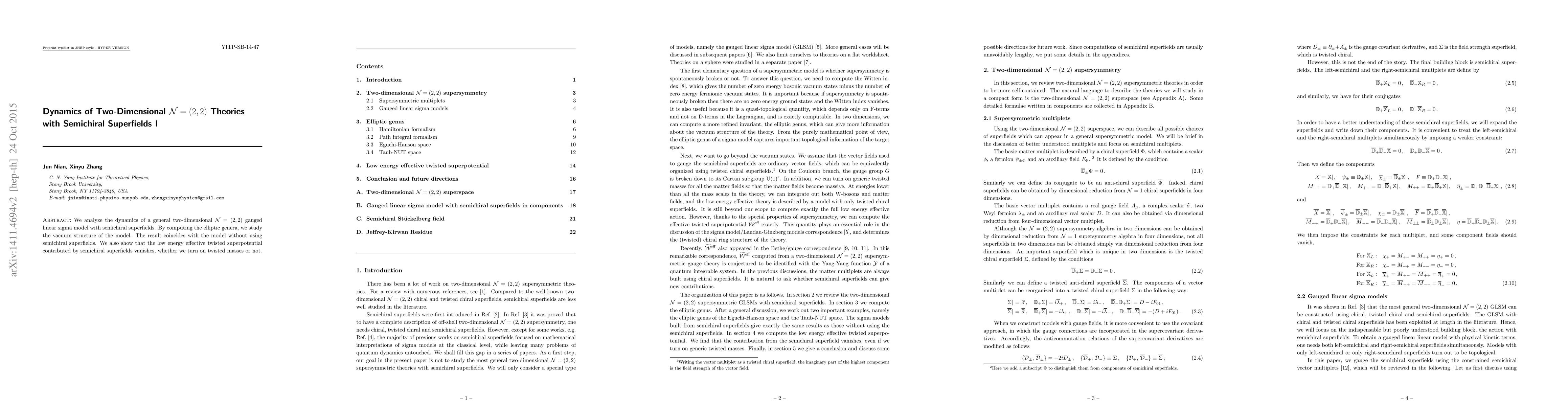 This paper analyzes a 2D supersymmetric model with semichiral superfields, finding that it has the same vacuum structure as its non-semichiral counterpart, and that low-energy effects from semichiral superfields vanish regardless of twisted masses.