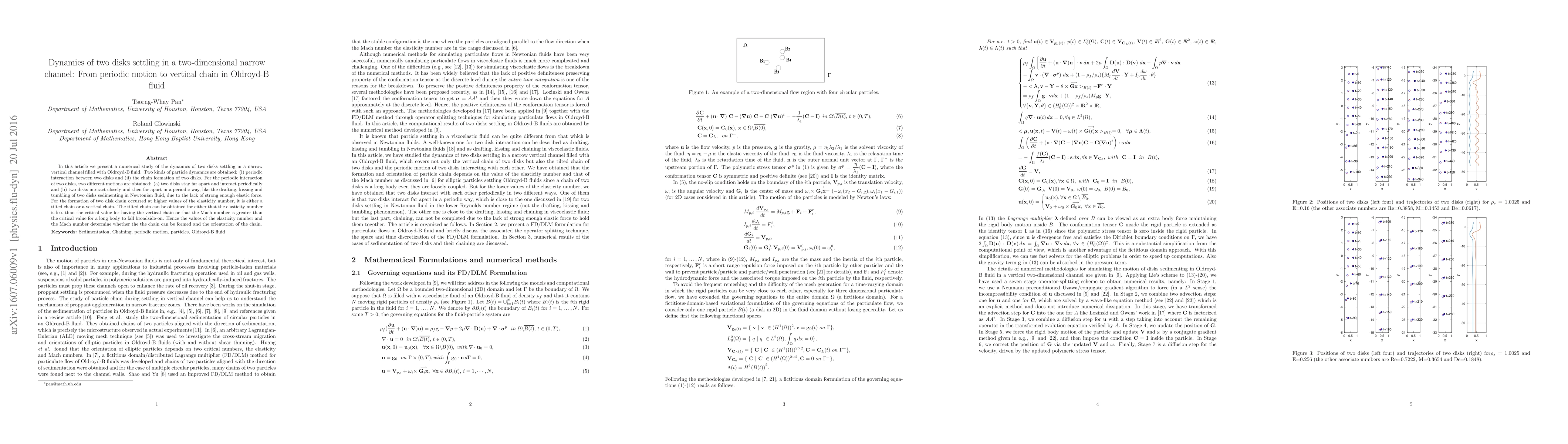 This paper numerically investigates the dynamics of two disks settling in a narrow vertical channel filled with Oldroyd-B fluid, revealing two main types of motion: periodic interaction and chain formation. The study identifies conditions under which disks form either periodic patterns or vertical chains, influenced by the elasticity number and Mach number.