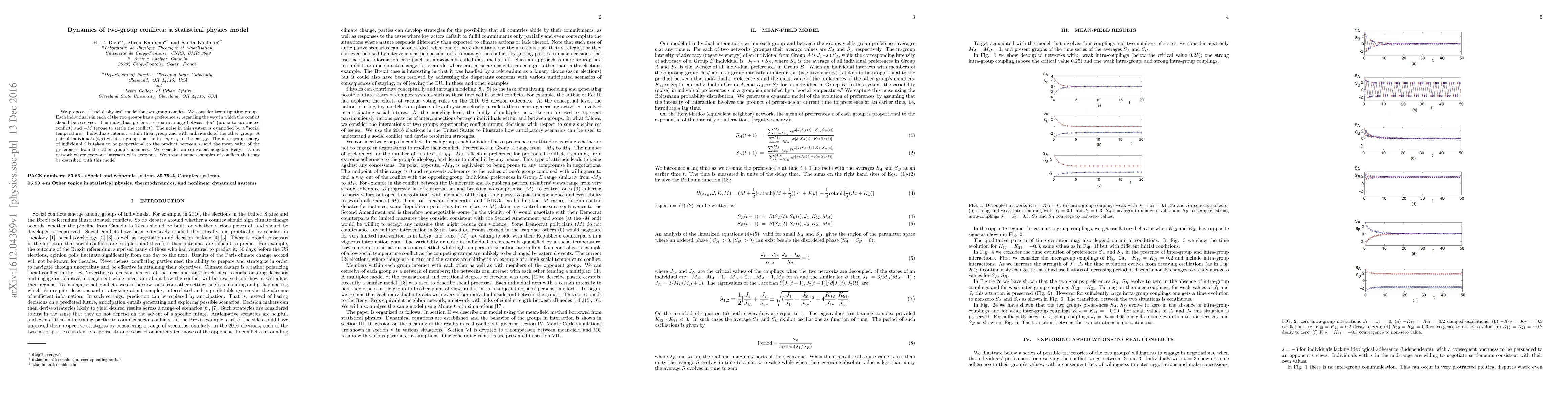 A statistical physics model describes two-group conflicts based on individual preferences for conflict resolution, with interactions between group members and individuals of the opposing group influencing the outcome. The model uses a social temperature to quantify noise and predicts conflicts that may be settled or prolonged.