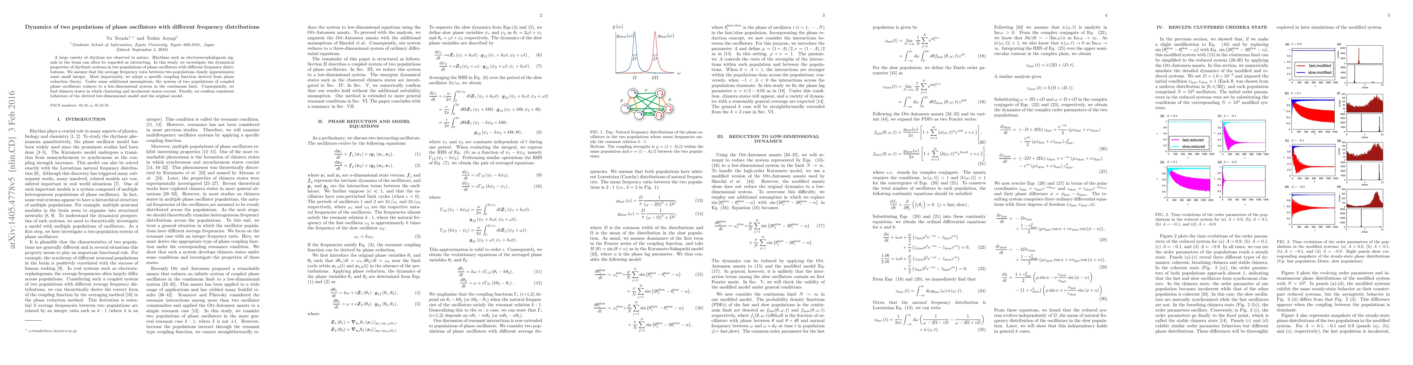 This study investigates the dynamics of two populations of phase oscillators with different frequency distributions, finding chimera states where clustering and incoherent behavior coexist.