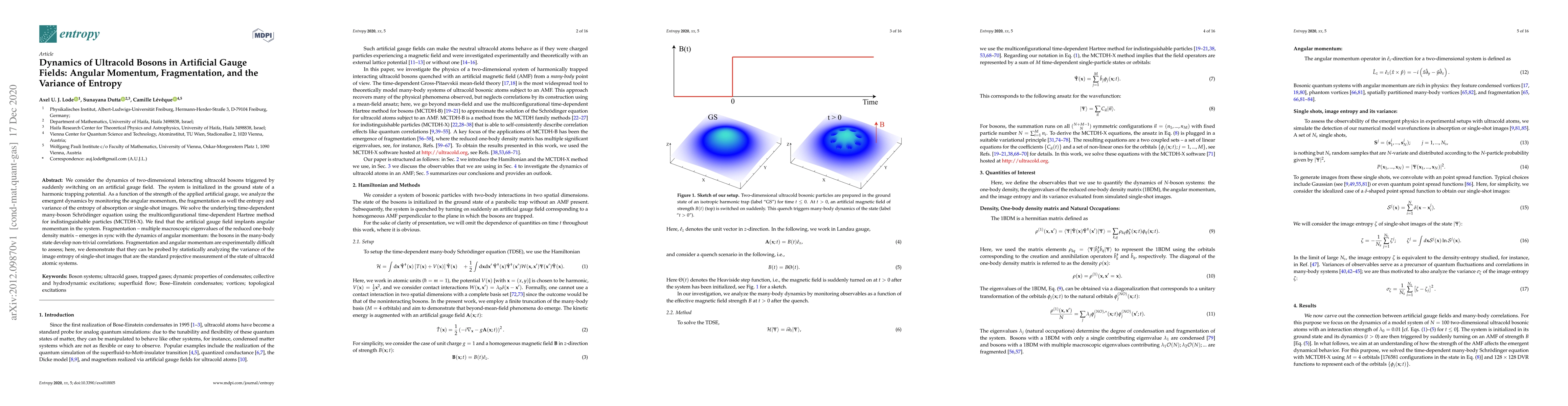 This paper investigates the dynamics of ultracold bosons in artificial gauge fields, focusing on the effects of angular momentum, fragmentation, and entropy variance. The study reveals that the gauge field induces angular momentum and fragmentation, which can be inferred from the variance of entropy in single-shot images.