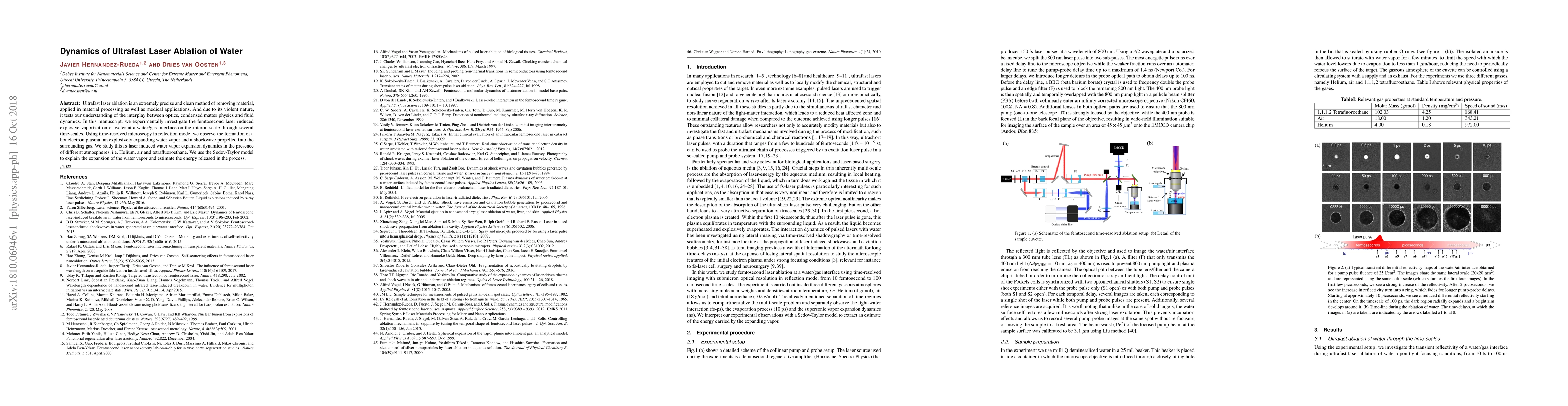 This paper investigates the dynamics of ultrafast laser ablation of water at the micron-scale, focusing on the explosive vaporization and shockwave formation at a water/gas interface. Time-resolved microscopy reveals the formation of a hot electron plasma and expanding water vapor, with the Sedov-Taylor model used to explain the vapor expansion and estimate the energy released under different atmospheric conditions.