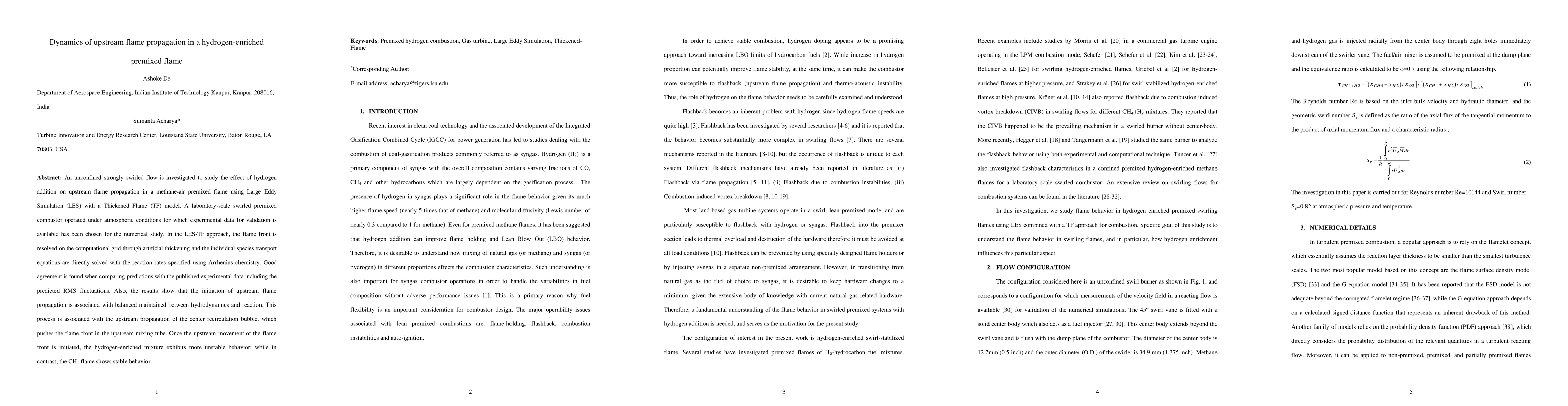 An unconfined strongly swirled flow is investigated to study the effect of hydrogen addition on upstream flame propagation in a methane-air premixed flame using Large Eddy Simulation (LES) with a Thickened Flame (TF) model. A laboratory-scale swirled premixed combustor operated under atmospheric conditions for which experimental data for validation is available has been chosen for the numerical study. In the LES-TF approach, the flame front is resolved on the computational grid through artificial thickening and the individual species transport equations are directly solved with the reaction rates specified using Arrhenius chemistry. Good agreement is found when comparing predictions with the published experimental data including the predicted RMS fluctuations. Also, the results show that the initiation of upstream flame propagation is associated with balanced maintained between hydrodynamics and reaction. This process is associated with the upstream propagation of the center recirculation bubble, which pushes the flame front in the upstream mixing tube. Once the upstream movement of the flame front is initiated, the hydrogen-enriched mixture exhibits more unstable behavior; while in contrast, the CH4 flame shows stable behavior.