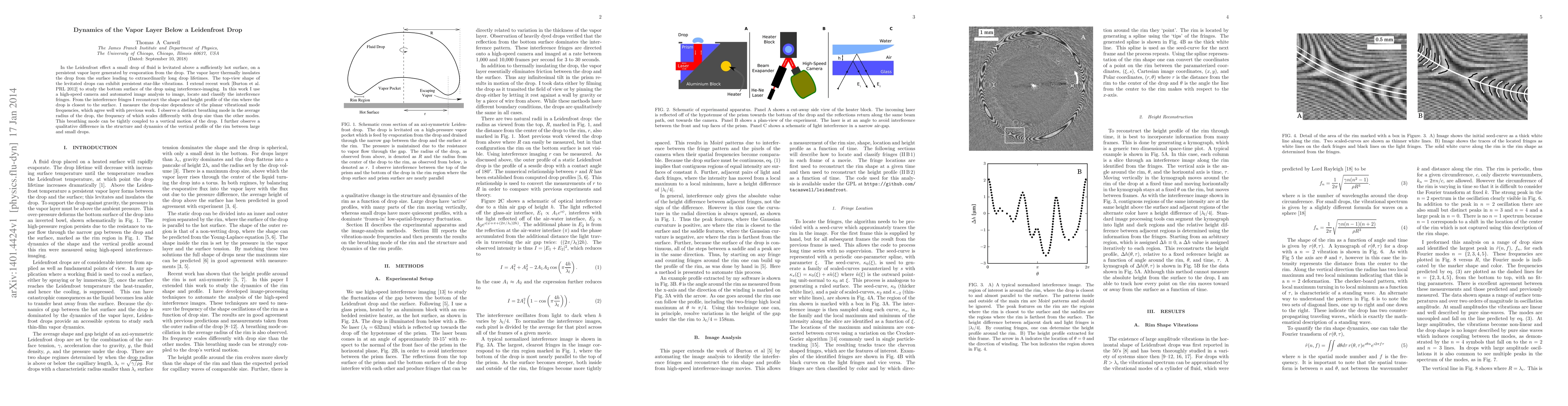 In the Leidenfrost effect a small drop of fluid is levitated above a sufficiently hot surface, on a persistent vapor layer generated by evaporation from the drop. The vapor layer thermally insulates the drop from the surface leading to extraordinarily long drop lifetimes. The top-view shape of the levitated drops can exhibit persistent star-like vibrations. I extend recent work [Burton et al. PRL 2012] to study the bottom surface of the drop using interference-imaging. In this work I use a high-speed camera and automated image analysis to image, locate and classify the interference fringes. From the interference fringes I reconstruct the shape and height profile of the rim where the drop is closest to the surface. I measure the drop-size dependence of the planar vibrational mode frequencies, which agree well with previous work. I observe a distinct breathing mode in the average radius of the drop, the frequency of which scales differently with drop size than the other modes. This breathing mode can be tightly coupled to a vertical motion of the drop. I further observe a qualitative difference in the structure and dynamics of the vertical profile of the rim between large and small drops.