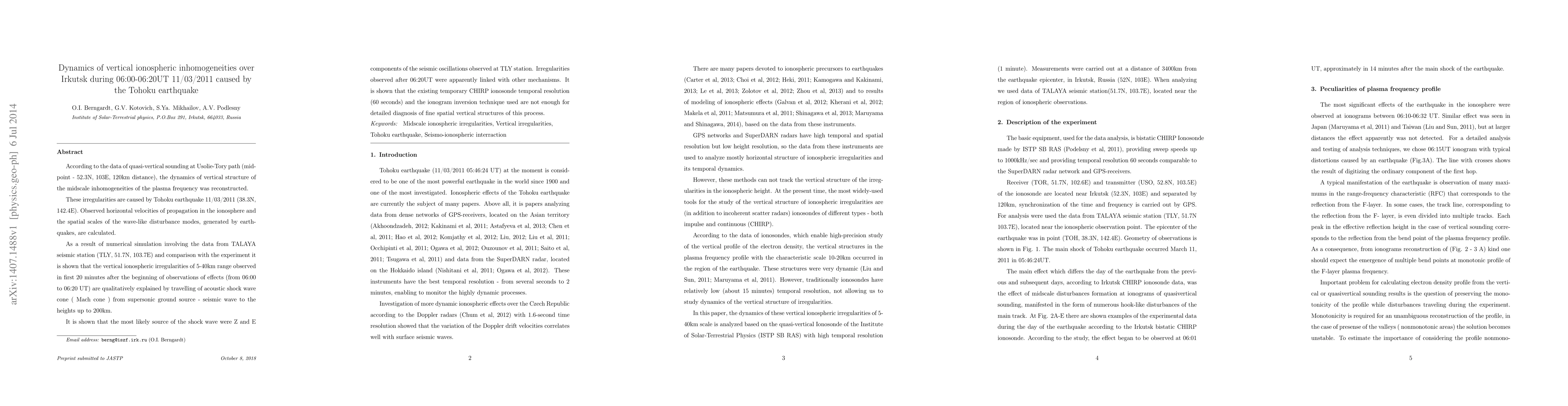 The paper presents a study on ionospheric disturbances in Irkutsk following the 2011 Tohoku earthquake. Using quasi-vertical sounding data, it's shown that acoustic shock waves from the earthquake caused ionospheric irregularities up to 200km high. The research suggests the Z and E components of seismic oscillations were the likely sources, and current ionosonde techniques are insufficient for detailed analysis of these structures.