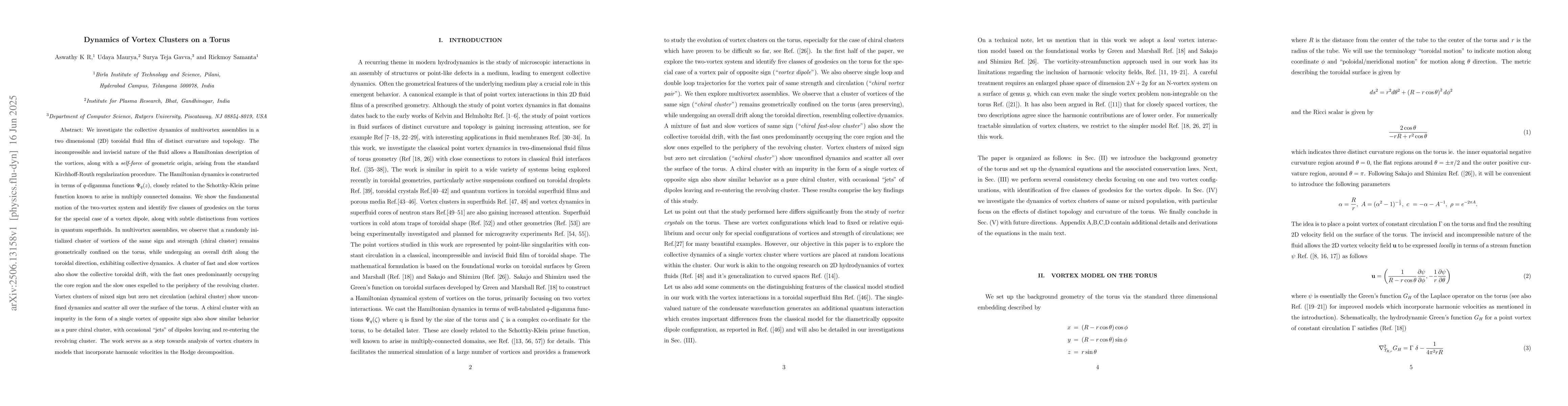 We investigate the collective dynamics of multivortex assemblies in a two dimensional (2D) toroidal fluid film of distinct curvature and topology. The incompressible and inviscid nature of the fluid allows a Hamiltonian description of the vortices, along with a self-force of geometric origin, arising from the standard Kirchhoff-Routh regularization procedure. The Hamiltonian dynamics is constructed in terms of $q$-digamma functions $\Psi_q(z)$, closely related to the Schottky-Klein prime function known to arise in multiply connected domains. We show the fundamental motion of the two-vortex system and identify five classes of geodesics on the torus for the special case of a vortex dipole, along with subtle distinctions from vortices in quantum superfluids. In multivortex assemblies, we observe that a randomly initialized cluster of vortices of the same sign and strength (chiral cluster) remains geometrically confined on the torus, while undergoing an overall drift along the toroidal direction, exhibiting collective dynamics. A cluster of fast and slow vortices also show the collective toroidal drift, with the fast ones predominantly occupying the core region and the slow ones expelled to the periphery of the revolving cluster. Vortex clusters of mixed sign but zero net circulation (achiral cluster) show unconfined dynamics and scatter all over the surface of the torus. A chiral cluster with an impurity in the form of a single vortex of opposite sign also show similar behavior as a pure chiral cluster, with occasional ``jets" of dipoles leaving and re-entering the revolving cluster. The work serves as a step towards analysis of vortex clusters in models that incorporate harmonic velocities in the Hodge decomposition.