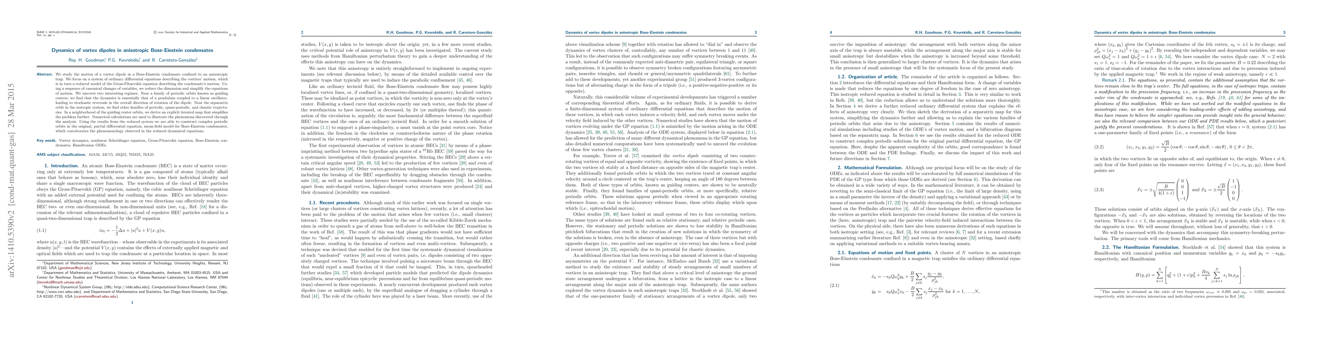 We study the motion of a vortex dipole in a Bose-Einstein condensate confined to an anisotropic trap. We focus on a system of ordinary differential equations describing the vortices' motion, which is in turn a reduced model of the Gross-Pitaevskii equation describing the condensate's motion. Using a sequence of canonical changes of variables, we reduce the dimension and simplify the equations of motion. We uncover two interesting regimes. Near a family of periodic orbits known as guiding centers, we find that the dynamics is essentially that of a pendulum coupled to a linear oscillator, leading to stochastic reversals in the overall direction of rotation of the dipole. Near the separatrix orbit in the isotropic system, we find other families of periodic, quasi-periodic, and chaotic trajectories. In a neighborhood of the guiding center orbits, we derive an explicit iterated map that simplifies the problem further. Numerical calculations are used to illustrate the phenomena discovered through the analysis. Using the results from the reduced system we are able to construct complex periodic orbits in the original, partial differential equation, mean-field model for Bose-Einstein condensates, which corroborates the phenomenology observed in the reduced dynamical equations.