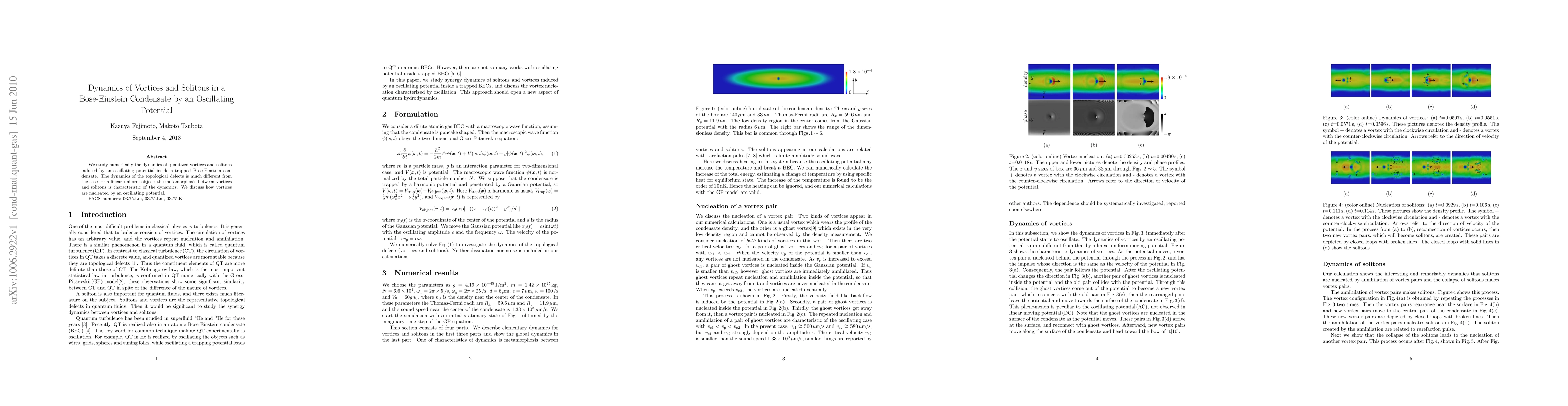 This paper numerically investigates the dynamics of quantized vortices and solitons in a Bose-Einstein condensate under an oscillating potential, revealing unique metamorphosis between vortices and solitons, and explores the nucleation of vortices by the oscillating potential.