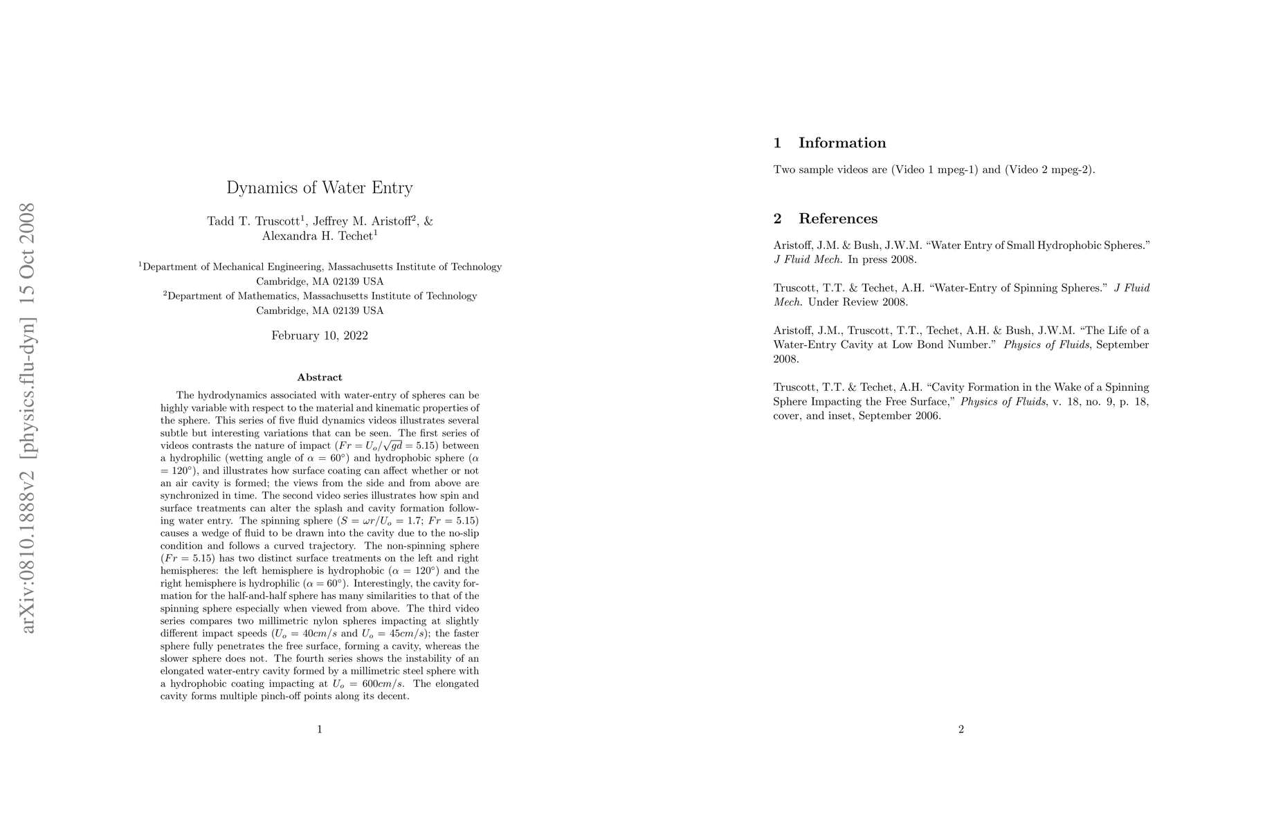 The hydrodynamics associated with water-entry of spheres can be highly variable with respect to the material and kinematic properties of the sphere. This series of five fluid dynamics videos illustrates several subtle but interesting variations. The first series of videos contrasts the nature of impact between a hydrophilic and hydrophobic sphere, and illustrates how surface coating can affect whether or not an air cavity is formed. The second video series illustrates how spin and surface treatments can alter the splash and cavity formation following water entry. The spinning sphere causes a wedge of fluid to be drawn into the cavity due to the no-slip condition and follows a curved trajectory. The non-spinning sphere has two distinct surface treatments on the left and right hemispheres: the left hemisphere is hydrophobic and the right hemisphere is hydrophilic . Interestingly, the cavity formation for the half-and-half sphere has many similarities to that of the spinning sphere especially when viewed from above. The third video series compares two millimetric nylon spheres impacting at slightly different impact speeds (Uo = 40 and 45 cm/s); the faster sphere fully penetrates the free surface, forming a cavity, whereas the slower sphere does not. The fourth series shows the instability of an elongated water-entry cavity formed by a millimetric steel sphere with a hydrophobic coating impacting at Uo = 600 cm/s. The elongated cavity forms multiple pinch-off points along its decent. Finally, a millimetric steel sphere with a hydrophobic coating breaks the free surface with an impact speed of Uo = 350 cm/s. The cavity pinches-off below the surface, generating a Worthington jet that pinches into droplets owing to the Rayleigh-Plateau instability.